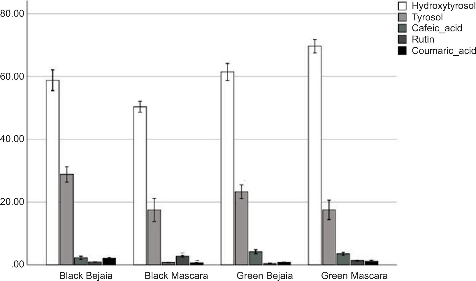 Similarly, the one-factor ANOVA test reported a highly significant difference (P < 0.001) regarding contents of hydroxytyrosol, caffeic acid, rutin, and coumaric acid and a highly significant difference (P < 0.01) for tyrosol (Figure 2). EOGM had the highest hydroxytyrosol content (69.67 mg/100 mL) compared to other samples, which contain various contents from 50.36 mg/100 mL to 61.45 mg/100 mL. EOGM contained a low level of tyrosol (17.51 mg/100 mL). On the other hand, other samples had high contents of tyrosol, ranging from 17.48 mg/100 mL to 28.8 mg/100 mL. The EOGM and EOGB samples had high levels of caffeic acid (3.5 mg/100 and 4.17 mg/100 mL, respectively). Black samples from either Mascara or Bejaia contained low levels of caffeic acid (0.77 mg/100 mL and 2.2 mg/100 mL, respectively). EOBM had the highest rutin content (2.72 mg/100 mL), compared to other samples, which had reliable contents of rutin, varying from 0.44 mg/100 mL in EOGB to 1.34 mg/100 mL recorded in EOGM. EOBB recorded the highest level of coumaric acid (2.06 mg/100 mL). On the other hand, other samples had low contents that vary from 0.61 mg/100 mL in EOBM to 1.1 mg/100 mL in EOGM (Table 2).
