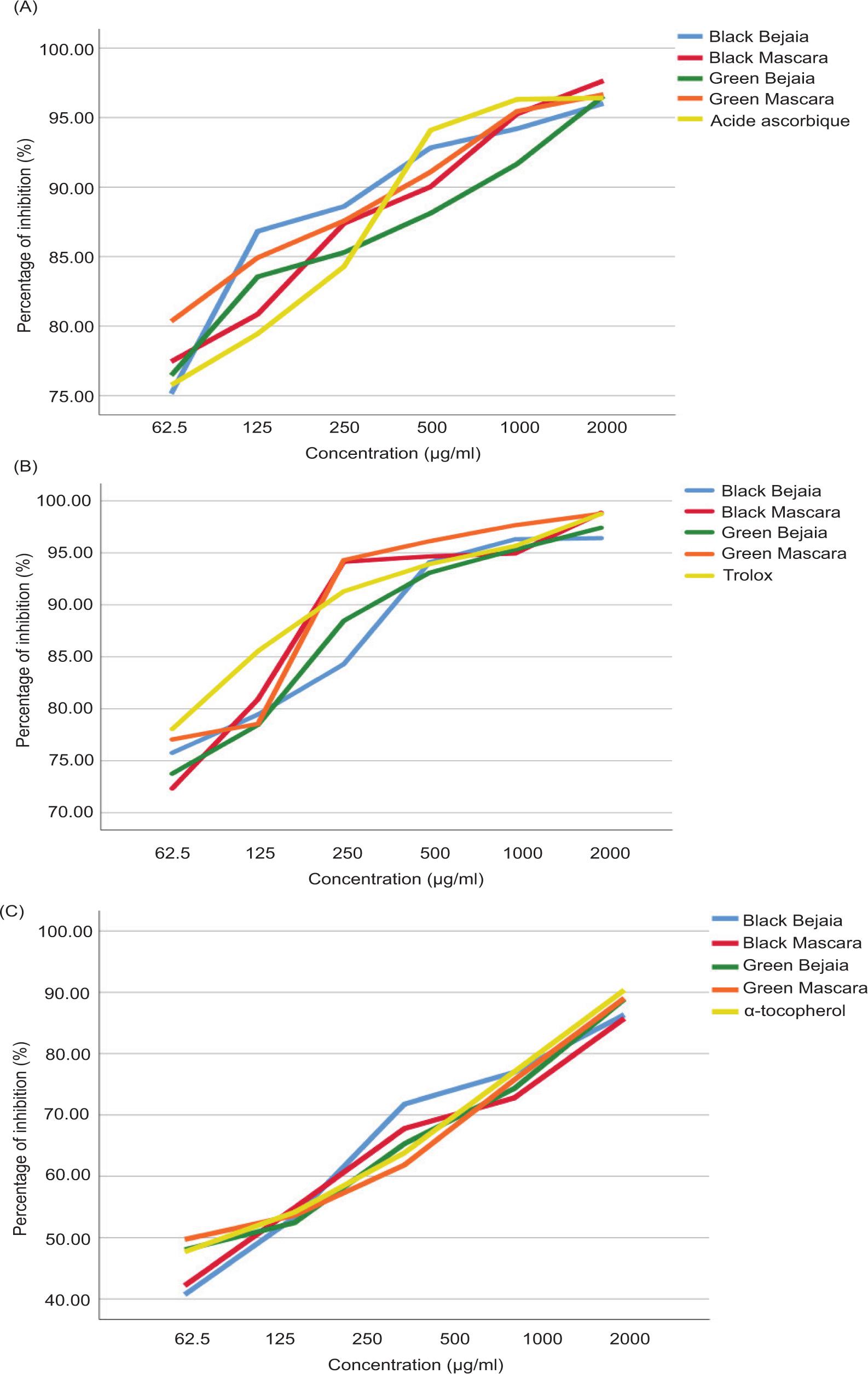 At all the concentrations tested, the ethyl acetate extracts of olive water significantly inhibited DPPH radical in a dose-dependent manner (P ≤ 0.01 against the negative control), and the Pearson correlation coefficient r varied from 0.92 to 0.99, which showed the existence of strong positive correlations in all relationships. EOGM extract showed the highest activity compared to all extracts, even ascorbic acid at the lowest concentration of 62.5 µg/mL. It inhibited 80.34% of DPPH radicals. As shown in Table 3, all extracts reached their maximum activity at the last concentration of 2,000 µg/mL. EOBM had the highest activity with an inhibition rate of 97.65 µg/mL, and EOGM reached an inhibition rate of 96.66% at the same concentration of 2,000 µg/mL.