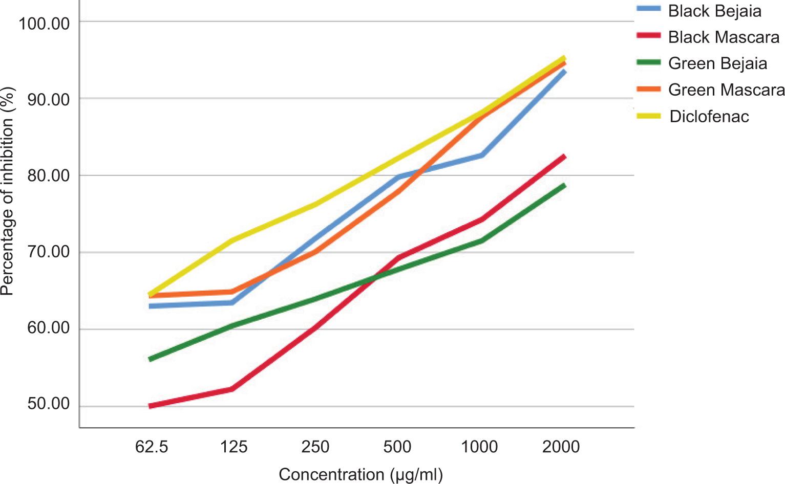 It was recorded across all the extracts tested that at the lowest concentration tested (62.5 µg/mL), EOGM showed the highest inhibition rate (64.36%), compared to other extracts tested, except the reference drug diclofenac, which had an inhibition rate of 64.44%. The inhibition proportions were progressively higher with the concentrations used. All extracts reached their maximum activity at 2,000 µg/mL; at the later concentration, EOGM had the maximum rate of inhibition (94.71%) but not higher than the Diclofenac reference (Table 3 and Figure 3).