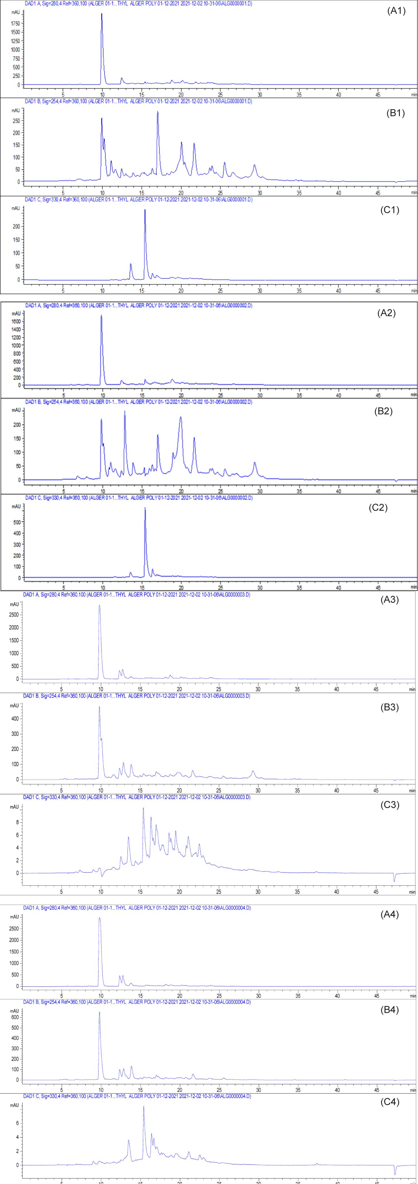 Figure 1. Chromatograms of ethyl acetate extract from brines at different wavelengths: 254 nm, 280 nm, and 330 nm. A1, B1, C1: EOBB; A2, B2, C2: EOBM; A3, B3, C3: EOGB; A4, B4, C4 EOBB: Extract of the brines of black olive of Bejaia; EOBM: extract of green olive brines from Mascara; EOGB: extract of green olive brines from Bejaia; EOGM: extract of green olive brines of Mascara (Sig).