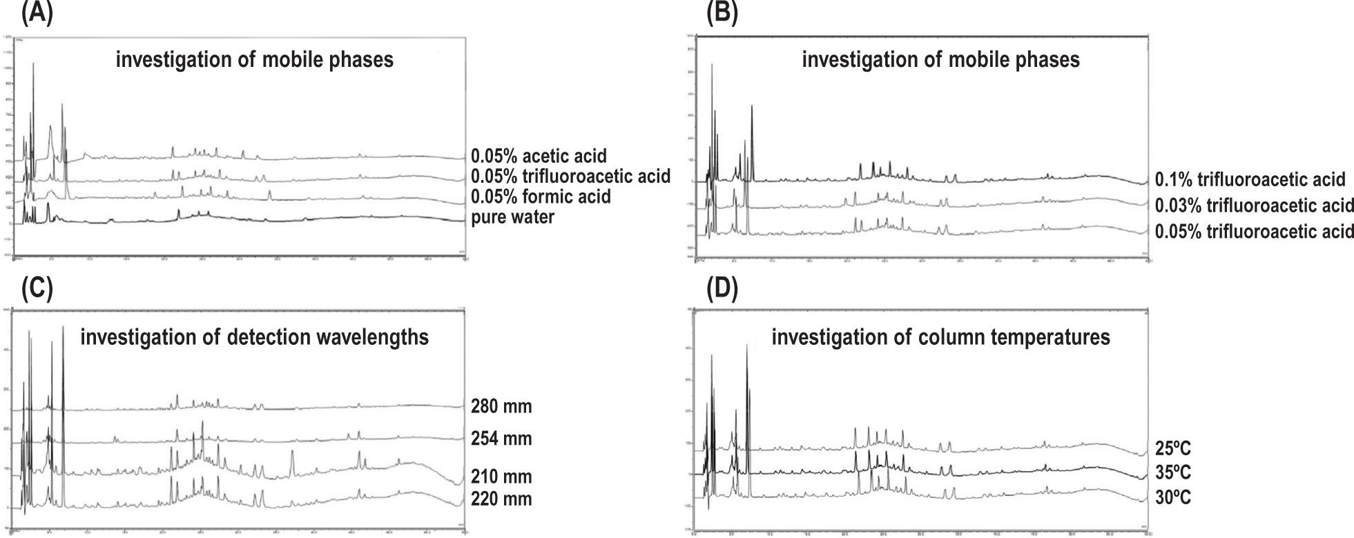 In order to obtain useful chemical information and better separation, several parameters including mobile phase composition, detection wavelength, and column temperature were carefully inspected as these parameters could positively influence the separation. The types and proportions of acid in the mobile phase were investigated. The conditions of adding 0.05% formic acid, 0.05% trifluoroacetic acid, 0.05% acetic acid, and pure water were also tested. As a result, 0.05% trifluoroacetic acid was better (Figure 1A). The conditions of adding 0.03% trifluoroacetic acid, 0.05% trifluoroacetic acid, and 0.1% trifluoroacetic acid in water were compared. The result showed that 0.1% trifluoroacetic acid was better (Figure 1B). The detection wavelength was tested at 210, 220, 254, and 280 nm. Under the wavelength of 220 nm, it was found that more detectable common peaks, larger response values, and smoother baseline could be observed (Figure 1C). The column temperatures of 25°C, 30°C, and 35°C were evaluated. The result showed that the peak separation at 30°C was better (Figure 1D). The optimization of the chromatographic conditions is shown in Figure 1 and the fingerprint spectrum is shown in Figure 2.