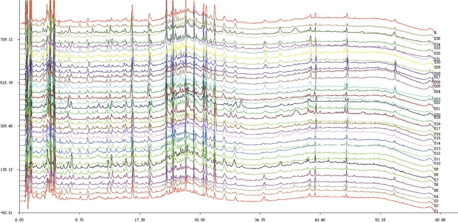 All chromatographic data of 35 batches of samples were exported as *.AIA file from UHPLC. Similarity analysis (SA) was performed on those files by using “Similarity Evaluation System for Chromatographic Fingerprint of Traditional Chinese Medicine” software (Version 2004A, Chinese Pharmacopoeia Committee). S1 was set as the reference fingerprint, and a new control fingerprint (R) was generated after multi-point correction and automatic matching, then the similarity values of these samples were calculated. In addition, the common peaks in UHPLC fingerprints were observed.