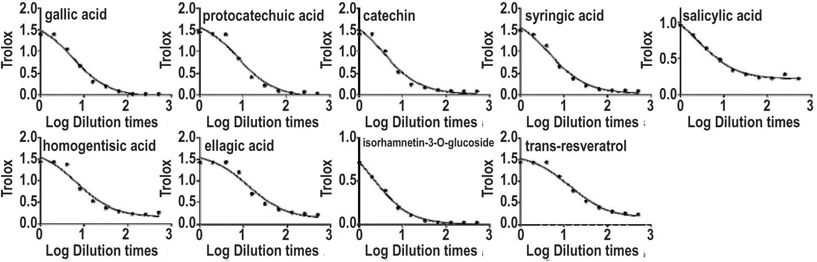 In order to demonstrate the antioxidant capacity of the screened compounds, the antioxidant activity of the nine standards was determined. The antioxidant capacity of standards was analyzed by ABTS scavenging assay and expressed as IC50. The standards were formulated as reserve fluids. Gallic acid (990 μg/mL), protocatechuic acid (1005 μg/mL), catechin (502.5 μg/mL), syringic acid (1025 μg/mL), salicylic acid (1004 μg/mL), homogentisic acid (1025 μg/mL), ellagic acid (980 μg/mL), isorhamnetin-3-O-glucoside (495 μg/mL), and isorhamnetin-3-Oglucoside (992 μg/mL) were diluted to 1, 2, 4, 8, 16, 32, 64, 128, 256, and 512 times to evaluate the antioxidant activity. The results showed that the screened compounds and selected compounds have antioxidant activity. The IC50 values are displayed in Figure 6 and the results are given in Table 6. An external experiment verified the result of correlation analysis.