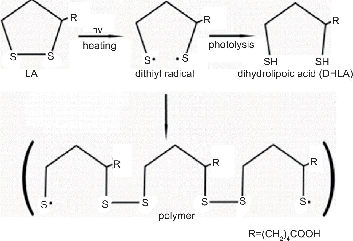 Reportedly, the five-membered dithiolane ring of LA is easily decayed by photoirradiation, and simultaneously DHLA is generated. In this process, first diethyl radical is formed by the breakdown of disulfide bond, after that, formation of intra/intermolecular hydrogen bond leads to DHLA generation (Wada et al., 2009). Bucher et al. (2005) conducted a study to examine the effect of laser flash on LA degradation and found production of carbon-centered radicals due to the breakdown of C-S bonds along with diethyl radicals (Figure 2). In addition, they have reported formation of DHLA by irradiation of ultraviolet C (UVC). Furthermore, their study emphasized that the degradation and regeneration of LA happens simultaneously under ultraviolet (UV) radiation. The transformation of radicals such as the thiol group by breakdown of S-S bond protects LA from degradation. The Thiol group has been previously used for the radical transfer reagent in the synthesis of polymers. Hydrogen abstraction converts DHLA into reduced LA ion through intermolecular cyclization. In addition, oxidized form of LA (DHLA) can be converted into the reduced form of LA in the presence of thiolate.