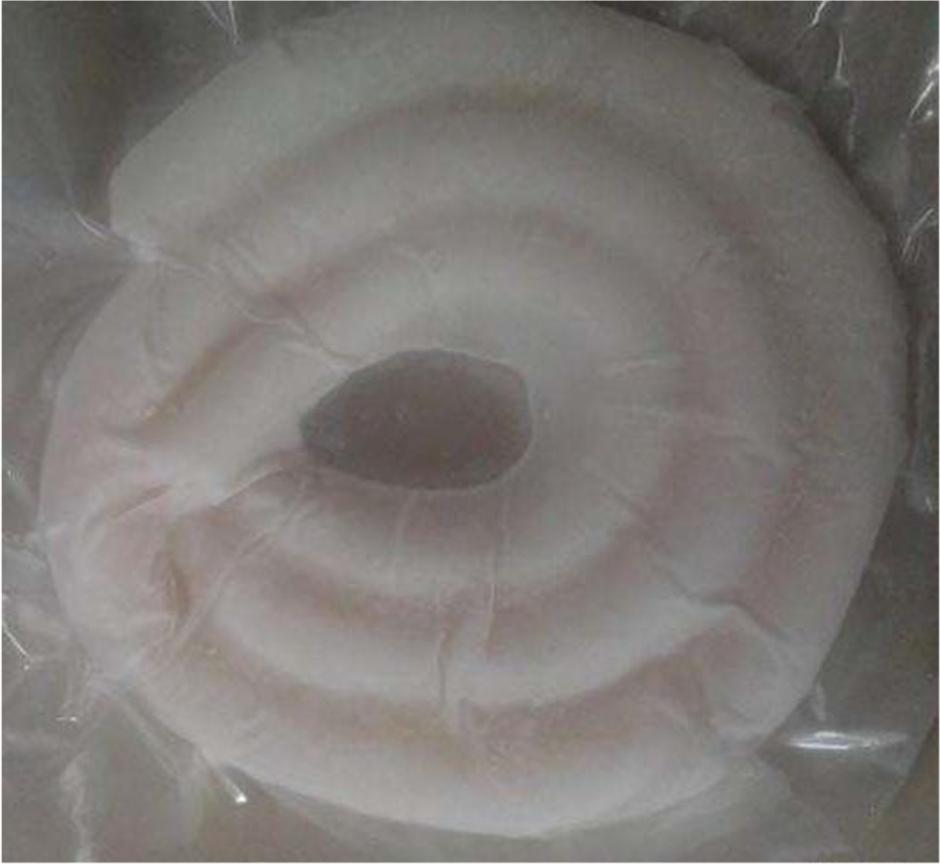 In this research, the sturgeon bone marrows were provided by Quzhou Xunlong Aquatic Products Sci-tech Development Co., Ltd, in Quzhou, Zhejiang, China, taken from adult sturgeon over 7 years of age after slaughter. A total of 54 sturgeon bone marrow samples weighing 600 ± 52 g each were transported to the laboratory using refrigerated transportation. Figure 1 shows a sample of frozen marrow.