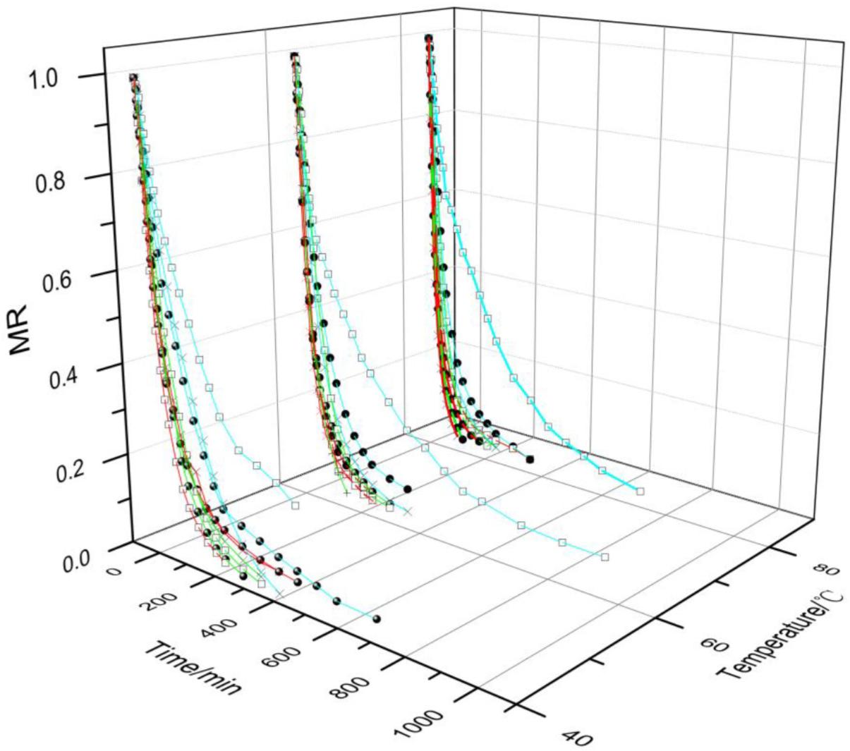 where MR, Mt, Mi, and Me are the moisture ratio, moisture content at a specific time, initial moisture content, and equilibrium moisture content, respectively.