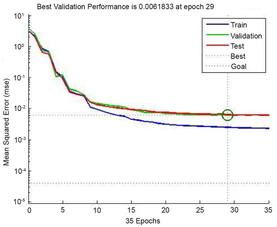 In summary, it is found that the feedforward backpropagation training algorithm was well suited for prediction of the moisture ratio based on different parameters Figure 4 shows that the ANN structure with 4 inputs, 11 neurons in the hidden layer, and 1 neuron in the output layer had the lowest MSE (0.00232), and the highest R (0.99605) values in test period. Figure 5 shows the training error for different numbers of iterations.