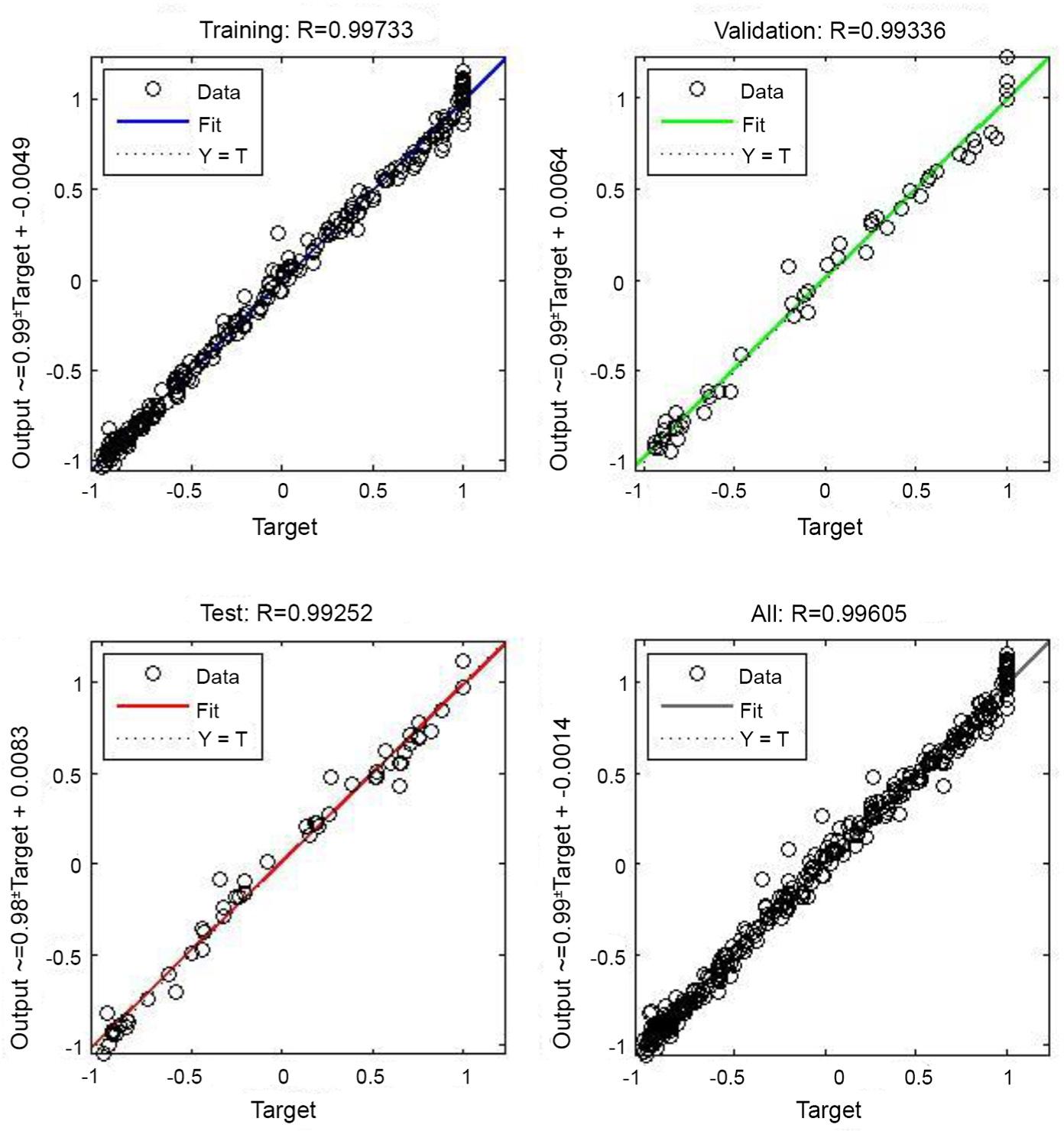 Using MATLAB’s features, the dataset was randomly divided into the three parts mentioned early: training, testing, and verification. A total of 27 different conditions and obtained 496 data points were tested. Of those 496, 348 is used for training, 75 for testing, and 75 for model validation. According to the estimated values of R in Figure 6, the best network topology occurred with 4 input layer neurons, 11 hidden layer neurons, and 1 output layer neurons, with the tansig transfer function and the Levenberg-Marquardt training algorithm.