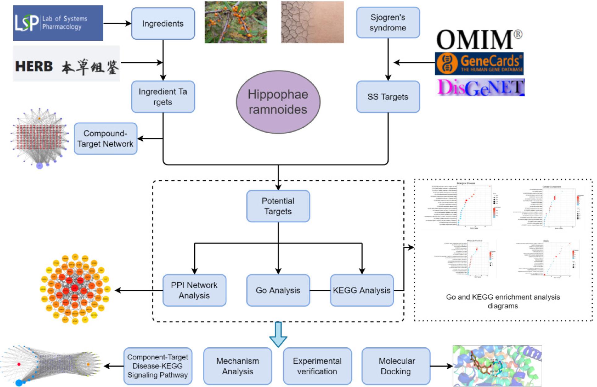 Traditional Chinese medicine (TCM) contains various active ingredients and carries complex mechanisms of action to treat and prevent diseases. In the Chinese Pharmacopoeia 2020 edition, Hippophae rhamnoides has been described as a dried fruit of Hippophae rhamnoides L. that can strengthen the spleen, help digestion, arrest cough, eliminate phlegm, activate blood circulation, and disperse blood stasis. This edible medicinal fruit is of a food and medicine continuum and contains a wide variety of active ingredients, such as flavonoids, tannins, terpenoids, polysaccharides, and vitamins. These -pharmacological ingredients exert a wide range of pharmacological activities, including anti--inflammatory, antioxidant, hepato-protective, anti-obesity, anti--cardiovascular disorder properties as well as anti--bacterial potency (Gao-Shuang et al., 2121; Heinrich et al., 2021). Further, an increasing number of studies have reported that Hippophae rhamnoides may exert desirable therapeutic effects on Sjögren’s syndrome. However, its potential active ingredients and underlying mechanism remain elusive.