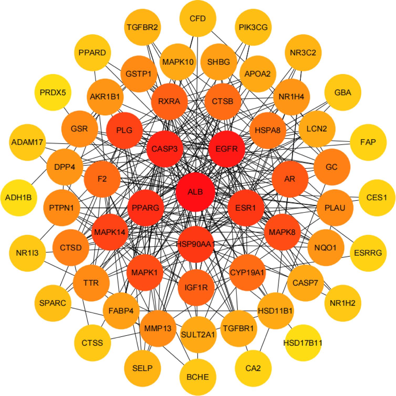 The STRING database was utilized to obtain the PPI network topology by importing 87 potential targets of Hippophae rhamnoides for improving Sjögren’s syndrome. The first 58 targets of the PPI network are shown in Figure 4. The network had 58 nodes and 269 edges with an average node degree of 9.276 and an average local clustering coefficient of 0.597. The built-in Network Analyzer function in Cytoscape 3.8.2 demonstrated that ALB, epidermal growth factor receptor (EGFR), epidermal growth factor receptor/Caspase-3 (CASP3), peroxisome proliferator-activated receptor gamma (PPARG), and estrogen receptor (ESR1) were the targets with large values and were of 43°, 28°, 25°, 24°, and 22°, respectively. It suggested that the efficacy mechanism of Hippophae rhamnoides in treating Sjögren’s syndrome could be closely related to these proteins.
