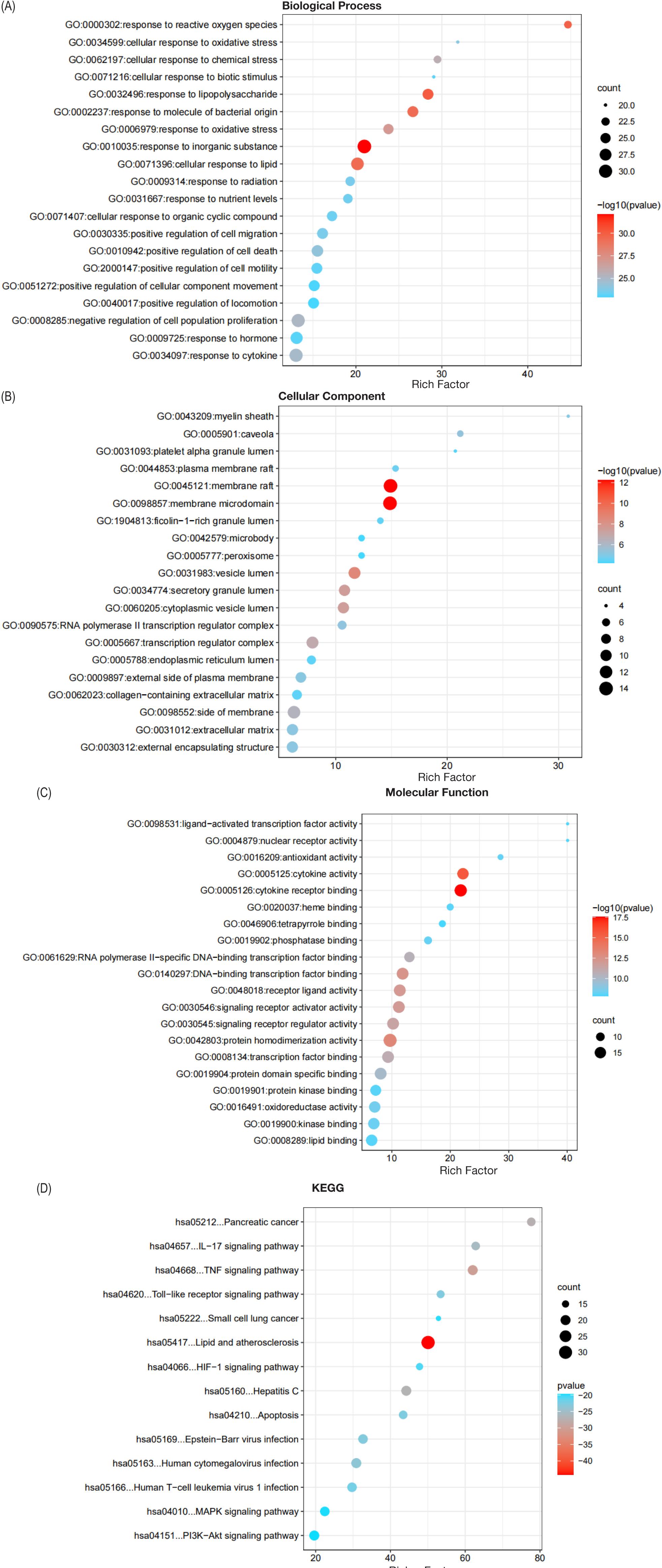 Figure 5. Gene ontology analysis for (A) BP, (B) CC, and (C) MF and pathway enrichment. (D) KEGG analysis of Hippophae rhamnoides–Sjögren’s syndrome overlapping target genes.