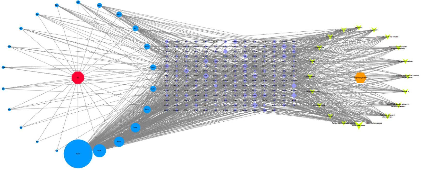 Figure 6. Component–target–pathway network. Blue circles represent active ingredients of Hippophae rhamnoides; green -circles represent signaling pathways of Sjögren’s syndrome; and purple circles represent the targets.