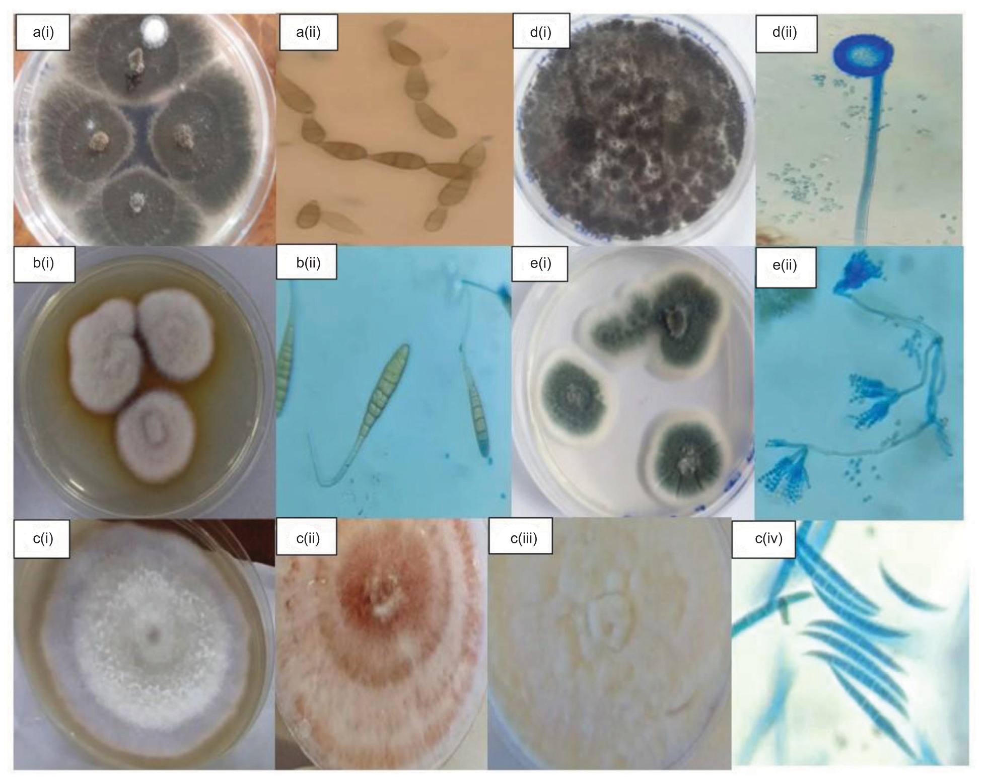 Figure 1. Fungal isolates from infected crops showing colony morphology, spores or conidia, conidiophores, hyphae and reproductive structures stained with cotton blue lactophenol dye using light microscopy, 40X: a(i) & a(ii) Alternaria alternata; b(i) & b(ii) Alternaria solani; c(i) Fusarium oxysporum; c(ii) Fusarium graminearum; c(iii) Fusarium equiseti; c(iv) macroconidia of Fusarium spp.; d(i) & d(ii) Aspergillus spp.; e(i) & e(ii) Penicillium spp.