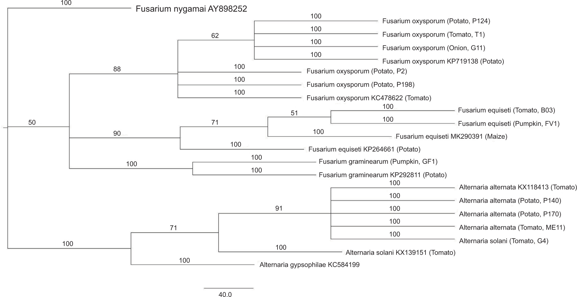 A phylogenetic tree was constructed to illustrate the possible genetic relatedness among Fusarium and Alternaria spp. isolates from onion, potato, pumpkin and tomato samples, and several mycotoxigenic fungi already published in the literature (Figure 2). The tree revealed four main clades, with two outgroups (Fusarium nygamai and Alternaria gypsophilae) occurring in separate clades. Among the clade of Fusarium species, the sequences of F. oxysporum, F. equiseti and F. graminearum were observed to form separate subclusters. A. alternata and A. solani formed the other clade. Indeed, it can be observed from the resulting phylogenetic tree that all the isolates of Fusarium spp. and Alternaria spp. were clustered together with 100% bootstrap value, supporting their correct identification.