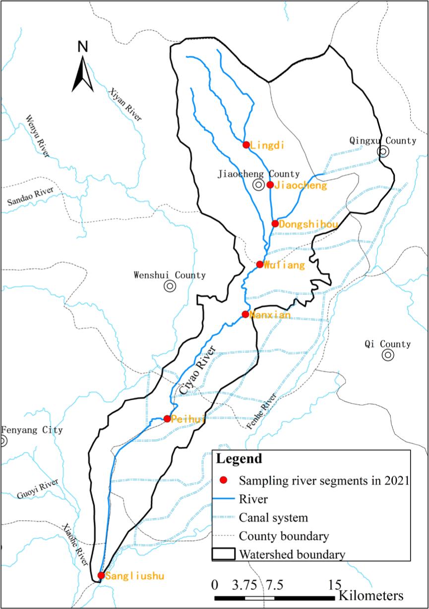 In accordance with the relevant contents of Water quality-Guidance on Sampling Techniques (HJ 494-2009) and the geomorphic characteristics of the Ciyao River Basin, and by taking into account the location of the confluence of various tributaries, seven sampling sites were set up in the trunk stream and tributaries of the Ciyao River: (1) Lingdi; (2) Jiaocheng; (3) Dongshihou; (4) Wuliang, (5) Nanxian; (6) Peihui; and (7) Sangliushu. Sections 1 and 2 are located in the upper reach, sections 3, 4, and 5 are in the middle reach, and sections 6 and 7 are located in the lower reach, and sampling was done in the wet (June and August), normal (April), and dry (October) seasons in 2021.