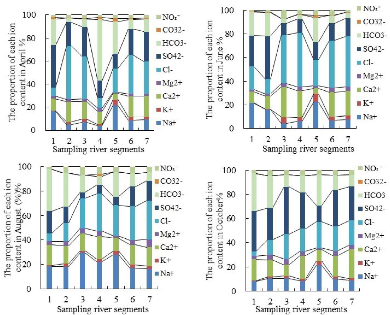 The characteristics of contents of ions in different river segments are shown in Figure 2. Cations in surface water in different river segments in the Ciyao River Basin in different months are dominated by Ca2+ and Na+. The portion of the total number of Ca2+ and Na+ in the total number of cations in April, June, August, and October was 83.87, 81.13, 84.97, and 83.46%, respectively. There is a big difference between the contents of anions in different river segments, with Lingdi dominated by anions SO42- and HCO3; Jiaocheng by Cl- and SO42- in April, and SO42 and HCO3- in June, August, and October; Dongshihou by Cl- and SO42-; Wuliang section by HCO3- in April, Cl- in June and August, Cl-, SO42-, and HCO3- in October; the mouth, through which Nanxian by Cl- and HCO3-; Peihui and Sangliushu by Cl- and SO42-.