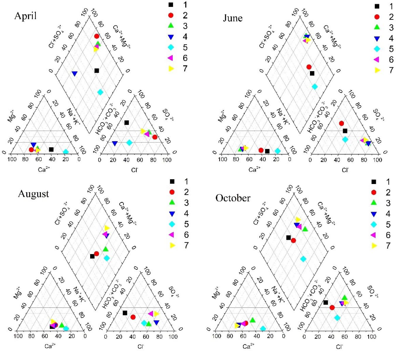 Figure 3. Piper diagram of major ions in surface water (1 Lingdi, 2 Jiaocheng, 3 Dongshihou, 4 Wuliang, 5 Nanxian, 6 Peihui, 7 Sangliushu).
