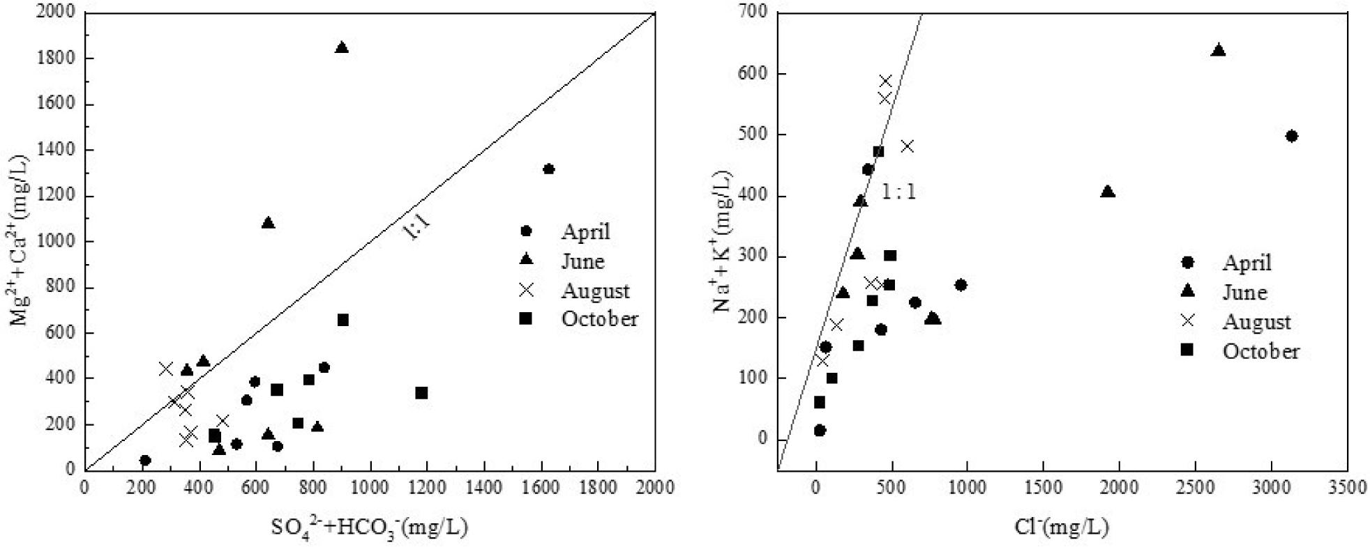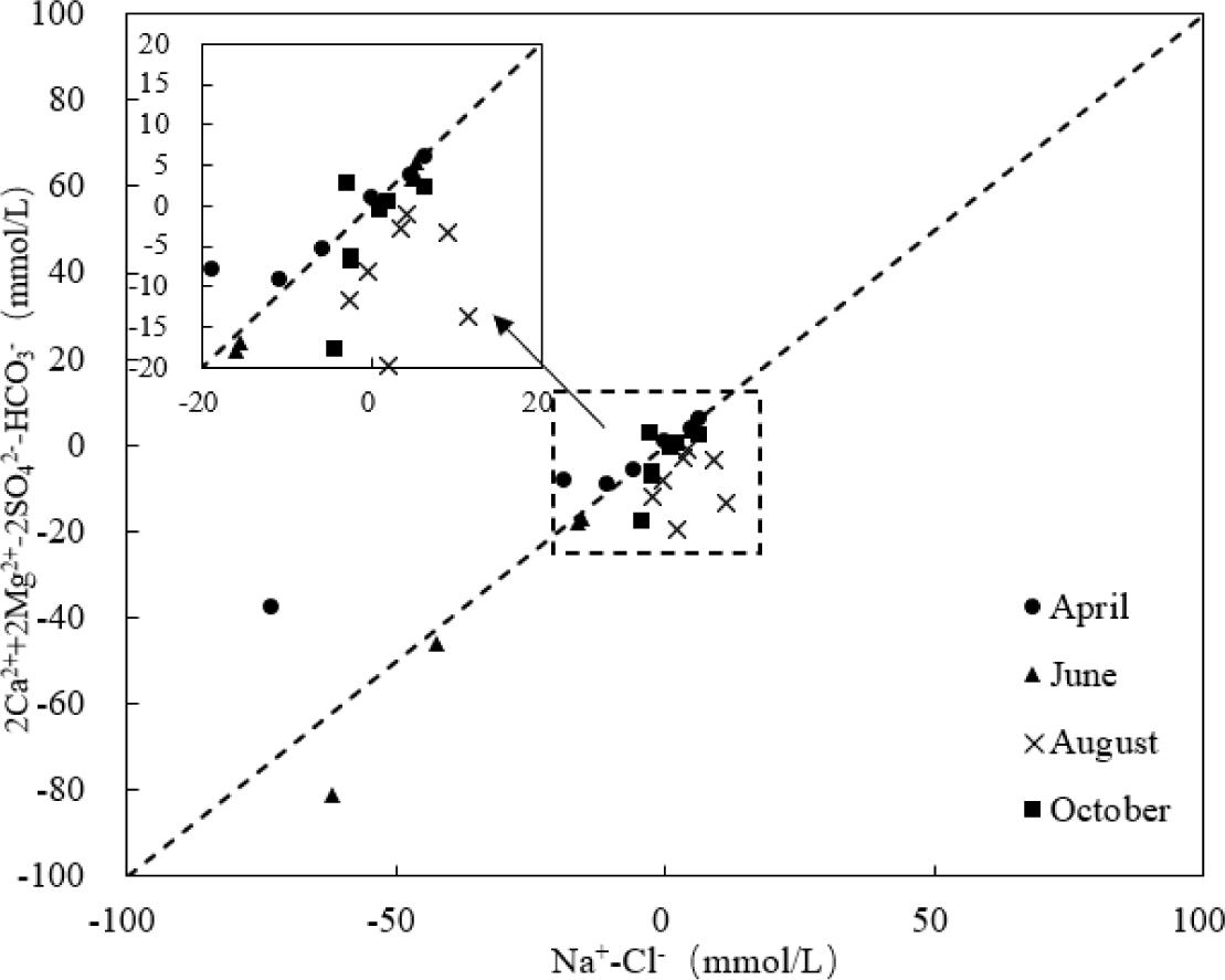 The action of alternate adsorption of cations is that under certain conditions, particles will absorb some cations in water and convert some cations previously absorbed into components in water (Hu et al., 2011). (Na+ – Cl-) and [2SO42- + HCO3- – (2Ca2+ + 2Mg2+)](mmol/L) allow for the decision as to whether the action of (Na+ – Cl-) occurs. If the process of cation exchange mainly dominates hydrogeochemical processes, the ratio of (Na+ – Cl-) to [2SO42- + HCO3- – (2Ca2+ + 2Mg2+)] should be distributed near the 1:1 line.