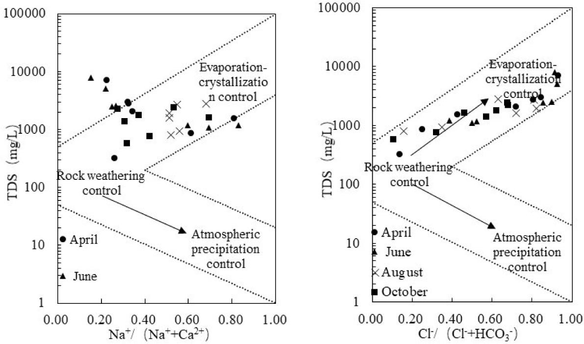 To study the natural factors that affect the origin of ions, the relevant importance of various origin mechanisms for ions in river water (effects of atmospheric precipitation, weathering, and evaporation–crystallization) is usually reflected in a macroscopic way using the relationship diagram of the cation’s mass concentration Na+/(Na+ + Ca2+) and TDS or the relationship diagram of Cl-/(Cl- + HCO3-) and TDS designed by Gibbs. In the control area of action of atmospheric precipitation, the TDS concentration is low (TDS < 10 mg/L), and the ratio of Na+/(Na+ + Ca2+) to Cl-/(Cl- + HCO3-) is high, normally at 0.5–1. This area is distributed on the lower-right corner of the Gibbs diagram; the action area of rock weathering is located in the middle-left part, with the TDS value normally at 70–300 mg/L and the ratio of Na+/(Na+ + Ca2+) to Cl-/(Cl- + HCO3-) normally less than 0.5; the control area of evaporation–crystallization is on the upper-right corner of the diagram, with a higher TDS (>300 mg/L) and higher ratios of Na+/(Na+ + Ca2+) and Cl-/(Cl- + HCO3-) (0.5 = 1).