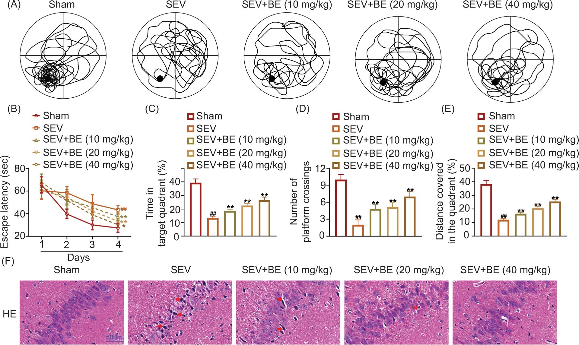 Figure 1. Breviscapine ameliorated sevoflurane-induced cognitive dysfunction in rats. (A–E) Morris water maze task was conducted to record climbing pathway, time to reach the platform (latency), time in target quadrant, number of platforms crossed, and distance covered in the quadrant. (F) Cell morphology of hippocampal neuron was observed using H&E staining. N = 6. ##P < 0.01. **P < 0.01. #vs. Sham. *vs. sevoflurane (SEV).