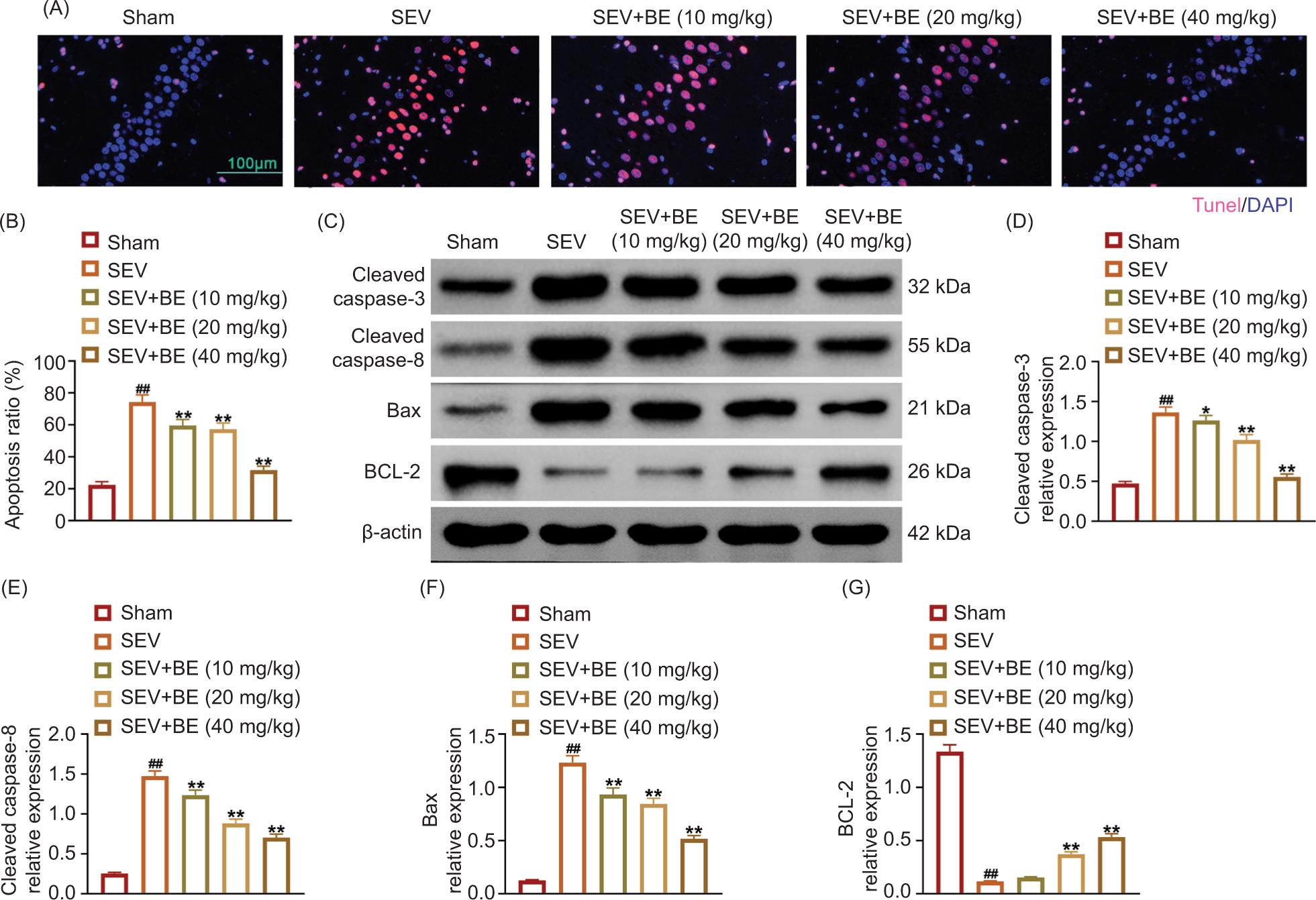 Figure 2. Breviscapine inhibited apoptosis in the brain tissues of sevoflurane-induced rats. (A and B) TUNEL was used to measure cell apoptosis in the hippocampal region of rats. (C–F) Cleaved caspase-3, cleaved caspase-8, Bax, and BCL-2 protein levels were detected through Western blot assay. N = 6. ##P < 0.01. *P < 0.05. **P < 0.01. #vs. Sham. *vs. sevoflurane (SEV).
