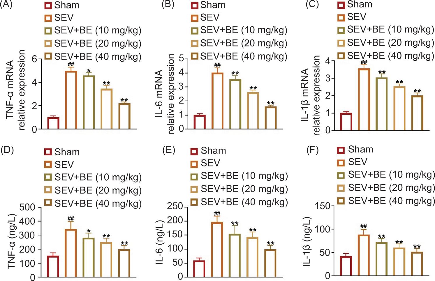 Figure 3. Breviscapine down-regulated inflammation in the brain tissues of sevoflurane-induced rats. (A–C) TNF-α, IL-6, and IL-1β mRNA levels were examined by qRT-PCR. (D–F) ELISA assay was performed to measure TNF-α, IL-6, and IL-1β levels. N = 6. ##P < 0.01. *P < 0.05. **P < 0.01. #vs. Sham. *vs. sevoflurane (SEV).