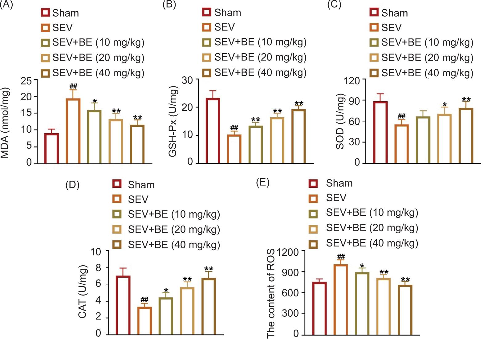 Figure 4. Breviscapine attenuated oxidative stress in the brain tissues of sevoflurane-induced rats. (A–D) MDA, GSH-Px, SOD, and CAT levels of brain tissues were analyzed using ELISA. (E) ROS content was analyzed using fluorescent spectrophotometry. N = 6. ##P < 0.01. *P < 0.05. **P < 0.01. #vs. Sham. *vs. sevoflurane (SEV).