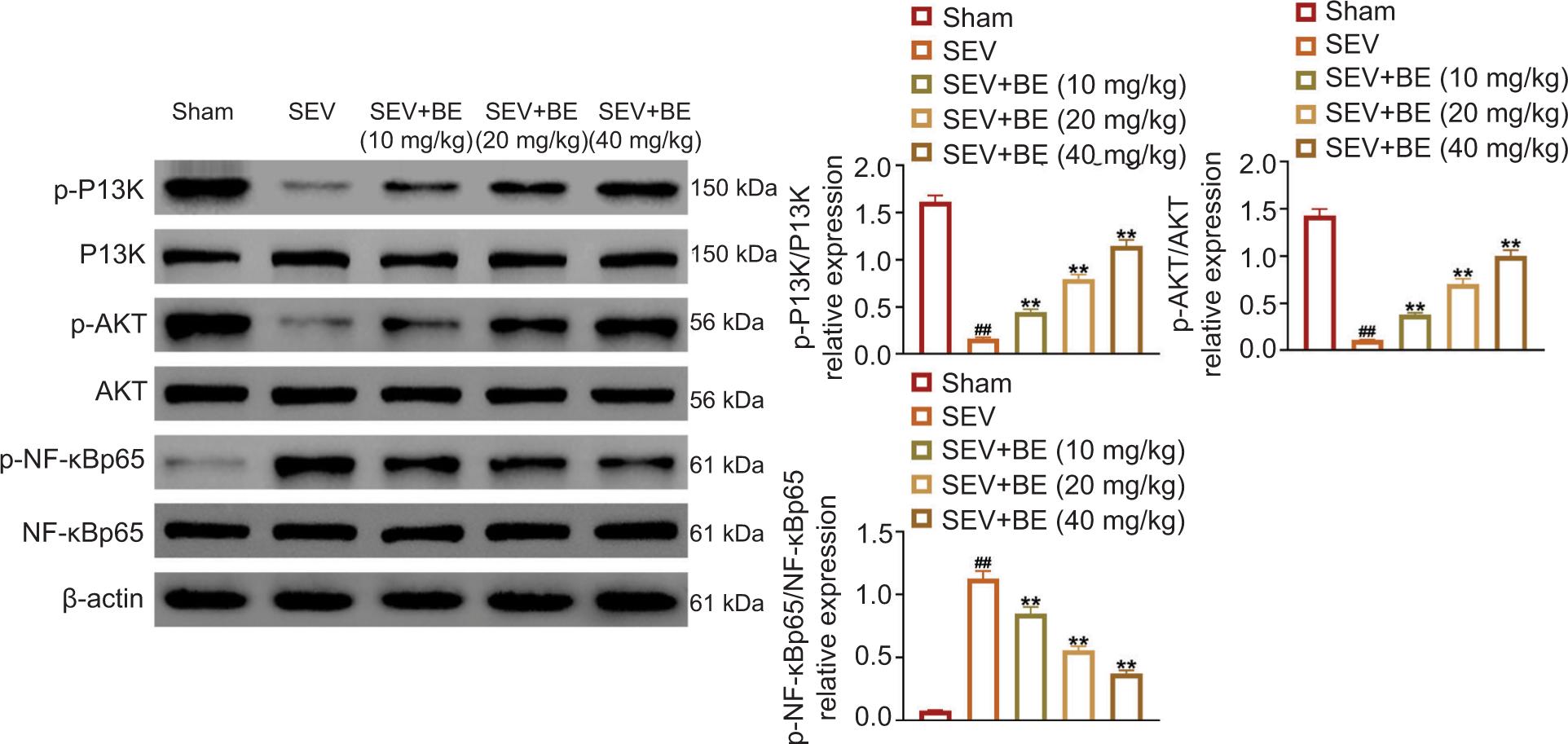 Figure 5. Breviscapine promoted PI3K/Akt pathway and inhibited NF-κB pathway in the brain tissues of sevoflurane-induced rats. Western blot assay was performed to detect p-PI3K, PI3K, p-Akt, Akt, p-NF-κB p65, NF-κB p65, and β-actin protein levels. N = 6. ##P < 0.01. **P < 0.01. #vs. Sham. *vs. sevoflurane (SEV).