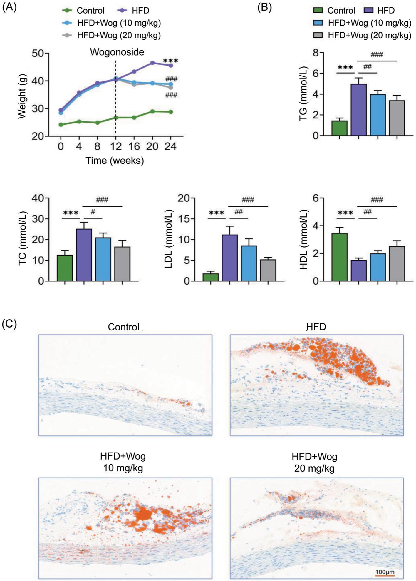 Figure 1. Wogonoside improves lipid metabolism disorders in ApoE -/- mice induced by HFD. (A) The body weight of ApoE-depleted mice in response to HFD and increasing level of Wog. (B) The level of TG, TC, HDL-c, and LDL-c in each mouse in response to HFD and increasing level of Wog. (C) Oil red O staining in each mouse in response to HFD and increasing level of Wog. ***, P < 0.001 vs control; #, P < 0.05; ##, P < 0.01; ###, P < 0.001 vs HFD.
