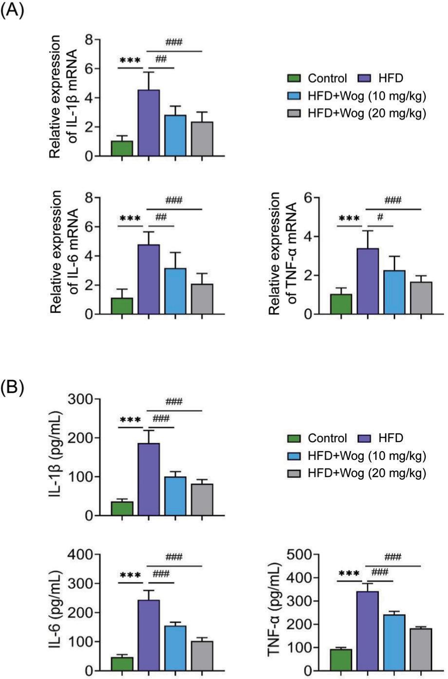 Figure 2. Wogonoside alleviates inflammatory response in ApoE -/- mice induced by HFD. The mRNA and level of IL-1β, IL-6, and TNF-α in each group were determined. ***, P < 0.001 vs control; #, P < 0.05; ##, P < 0.01; ###, P < 0.001 vs HFD.