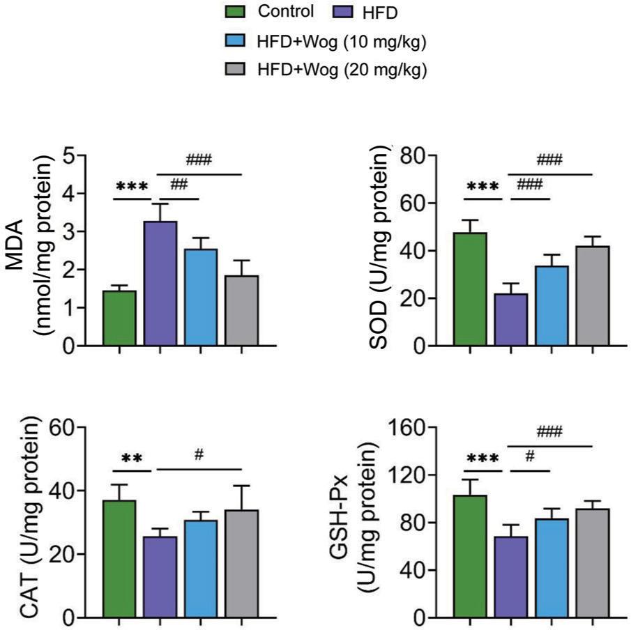Figure 3. Wogonoside ameliorates oxidative stress in ApoE -/- mice induced by HFD. The levels of SOD, MDA, GSH-Px, and CAT in each mouse in response to HFD and increasing level of Wogonoside were detected. **, P < 0.01, ***, P < 0.001 vs control; #, P < 0.05; ##, P < 0.01; ###, P < 0.001 vs HFD.