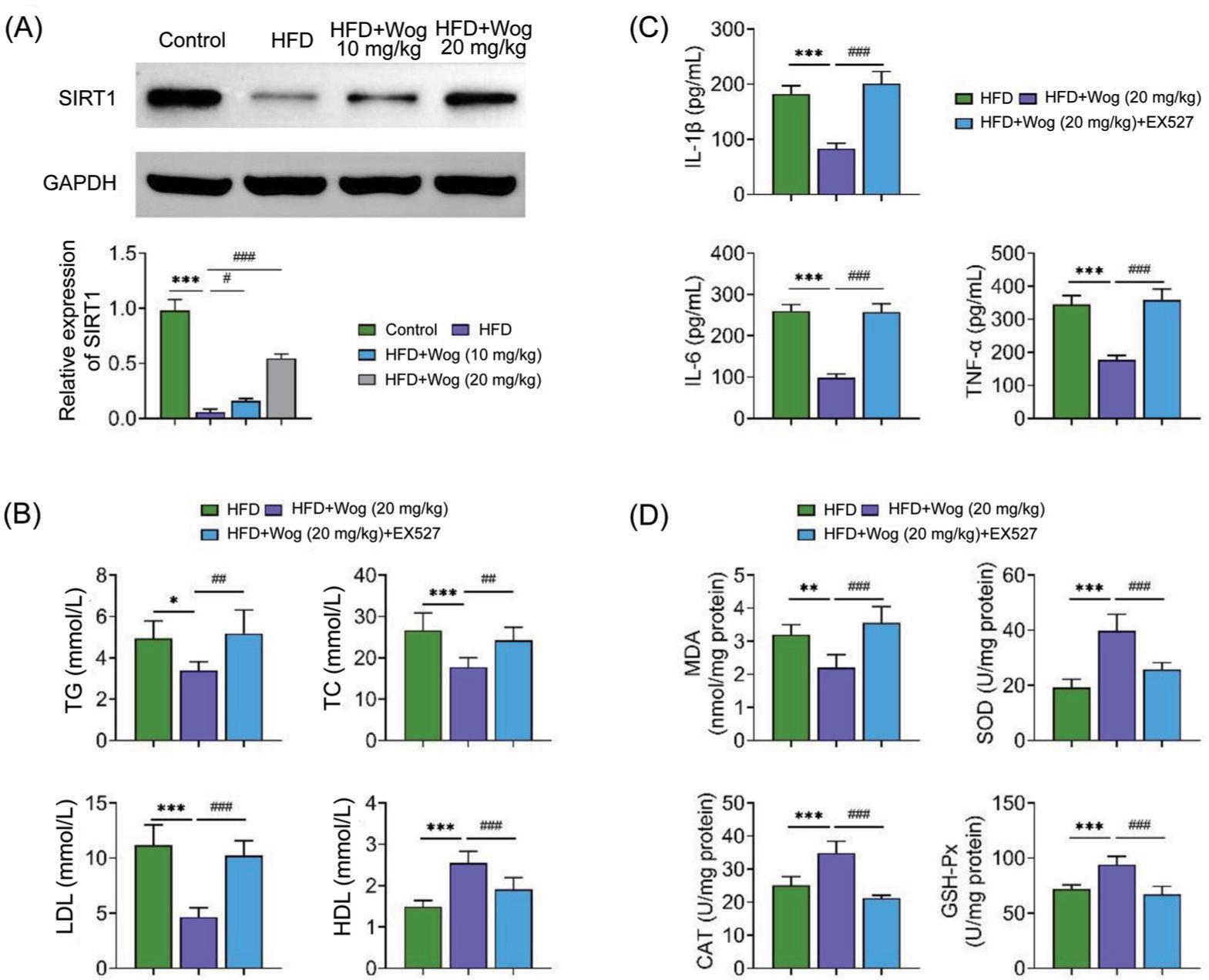 Figure 4. Wogonoside improves hyperlipidemia and inflammation by upregulating SIRT1 expression. (A) Immunoblot assays depicted the expression of SIRT1 in each mouse in response to HFD and increasing level of Wog. (B) The levels of TG, TC, HDL-c, and LDL-c in each mouse in response to HFD, HFD+Wog, and HFD+Wog+EX527. (C) The levels of IL-1β, IL-6, and TNF-α in each mouse in response to HFD, HFD+Wog, and HFD+Wog+EX527. (D) The levels of SOD, MDA, GSH-Px, and CAT in each mouse in response to HFD, HFD+Wog, and HFD+Wog+EX527. *, P < 0.05, **, P < 0.01 ***, P < 0.001 vs HFD; #, P < 0.05; ##, P < 0.01; ###, P < 0.001 vs HFD+Wog.