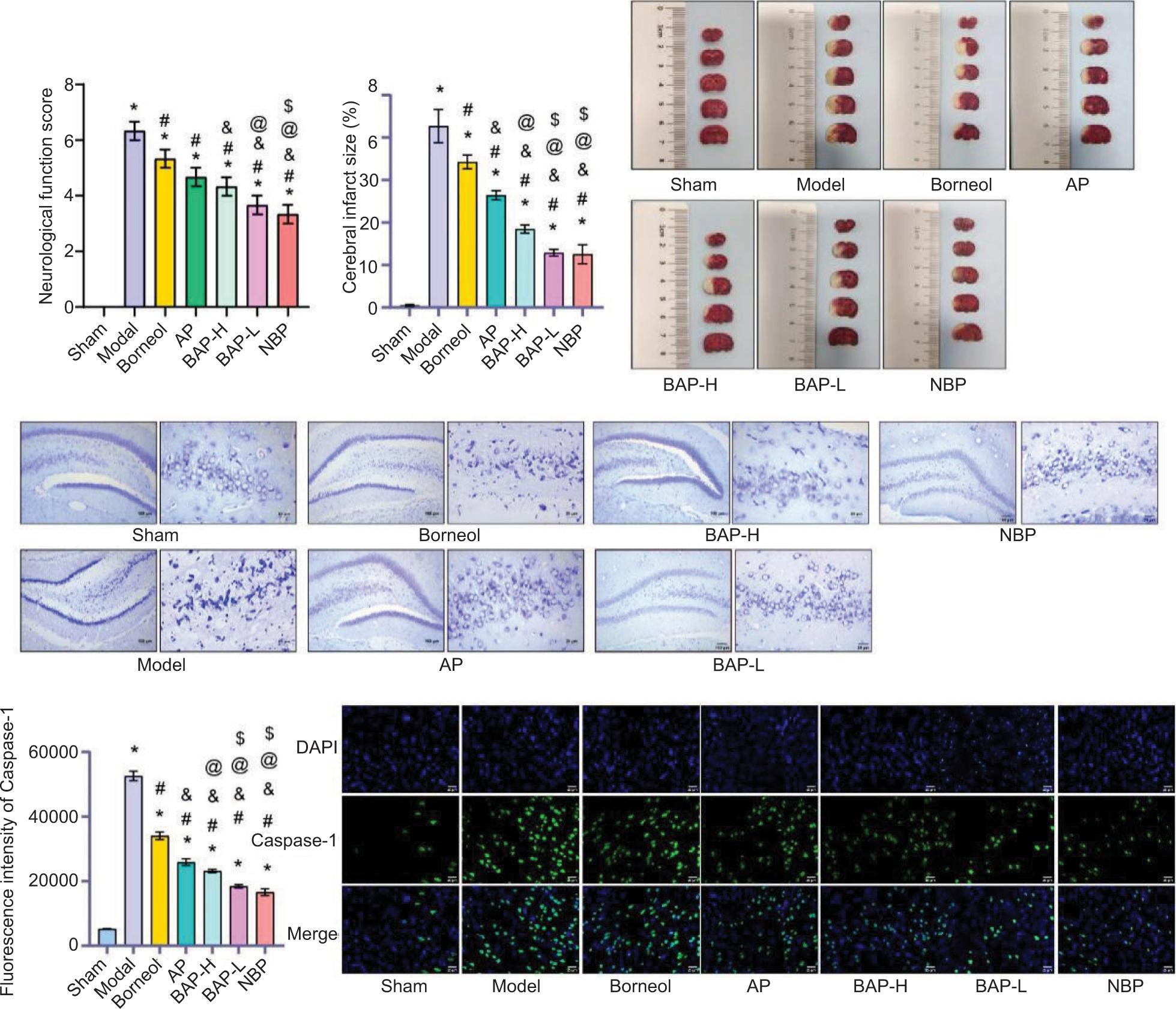Figure 2. BAP protected rats from CIR injury. (A) Neurological function score. (B) Cerebral infarct volume measurement. (C) Nerve cell survival was detected by Nissl staining, scale bar = 25 μm, 100 μm. (D) The pyroptosis of nerve cells in the hippocampal region of rats was detected by immunofluorescence, scale bar = 25 μm. * P < 0.05 vs Sham group, # P < 0.05 vs Model group, & P <0.05 vs Borneol group, @ P < 0.05 vs AP group, $ P <0.05 vs BAP-H group.