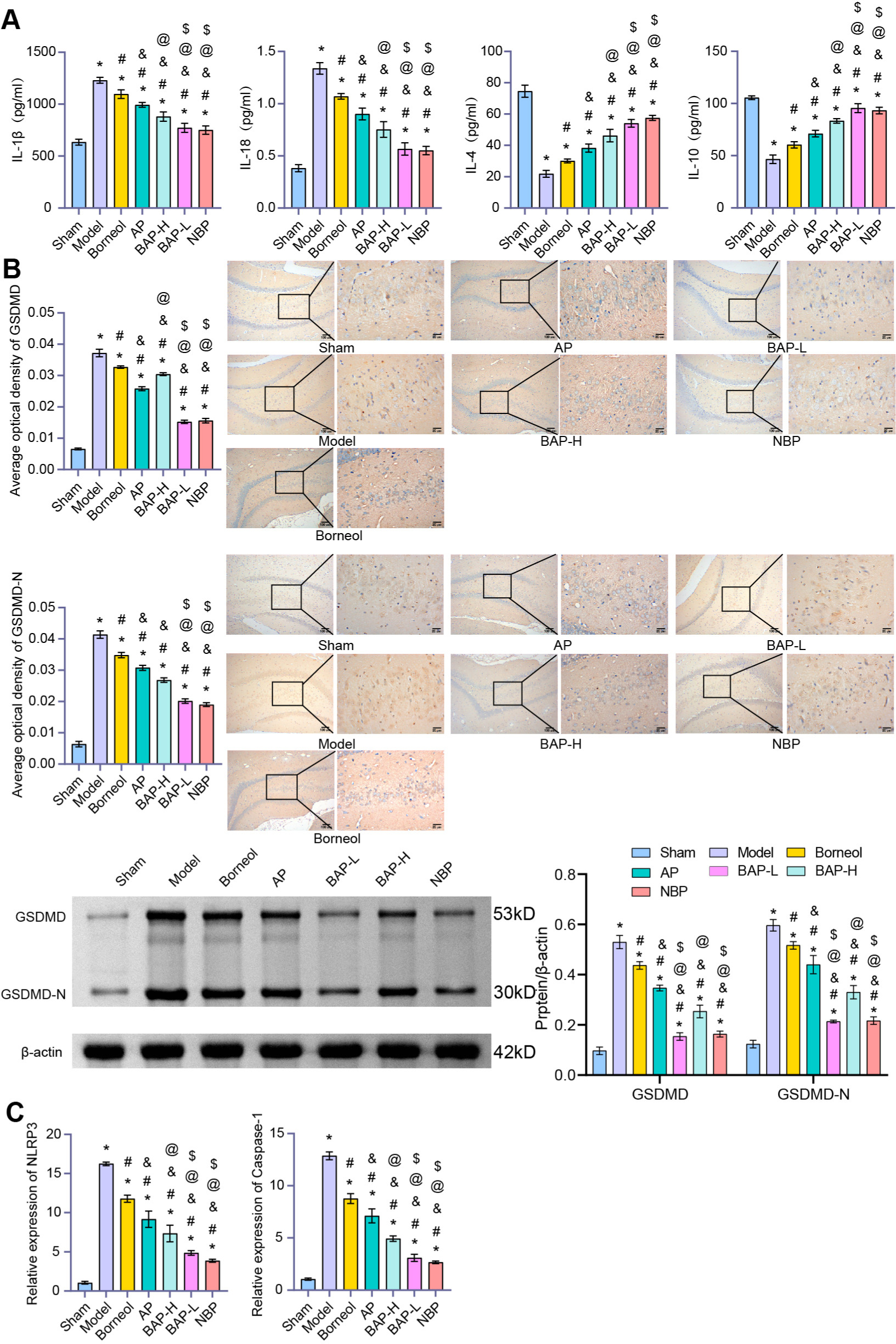Figure 3. BAP affected pyroptosis in the brain of rats with CIR injury. (A) The levels of IL-1β, IL-18, IL-4, and IL-10 were detected by ELISA. (B) The levels of GSDMD and GSDMD-N were determined by immunohistochemistry and western blot, scale bar = 100 μm, 25 μm. (C) RT-qPCR was adopted to measure the expressions of NLRP3 and Caspase-1. * P < 0.05 vs Sham group, #P < 0.05 vs Model group, & P < 0.05 vs Borneol group, @ P < 0.05 vs AP group, $ P < 0.05 vs BAP-H group. (D) Western blot was adopted to measure the expressions of NLRP3, pro-Caspase-1, and Caspase-1. (E) Immunohistochemistry and western blot were applied to detect Nrf2 and HO-1 expression, scale bar = 100 μm, 25 μm.