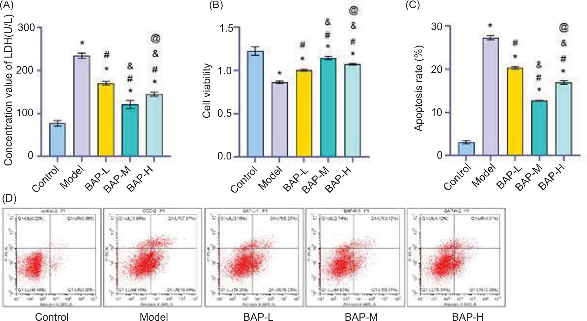 Figure 4. Detection of different doses of BAP on pyroptosis of SH-SY5Y cells in vitro. (A) LDH assay was used to determine cell damage. (B) CCK8 was used to detect cell viability. (C, D) Cell apoptosis was measured by flow cytometry. *P < 0.05 vs Control group, # P < 0.05 vs Model group, & P < 0.05 vs BAP-L group, @ P < 0.05 vs BAP-M group.