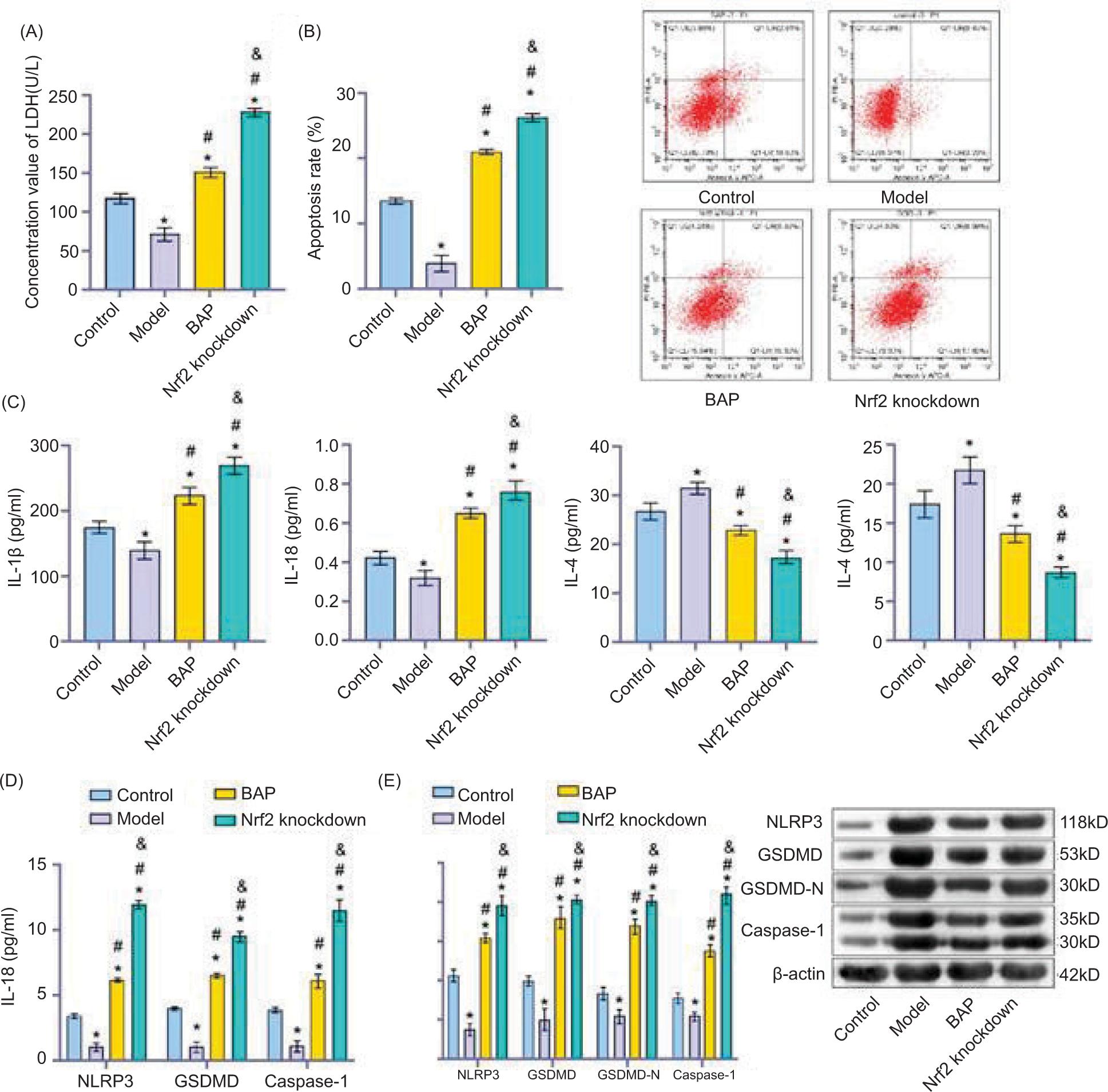 Figure 5. Detection of BAP on pyroptosis of SH-SY5Y cells in vitro. (A) LDH assay was used to determine cell damage. (B) Cell apoptosis was detected by flow cytometry. (C) The levels of IL-1β, IL-18, IL-4, and IL-10 were measured by ELISA. (D, E) The expressions of NLRP3, GSDME, and Caspase-1 were measured by RT-qPCR and western blot. *P < 0.05 vs Control group, #P < 0.05 vs Model group, &P < 0.05 vs BAP group.