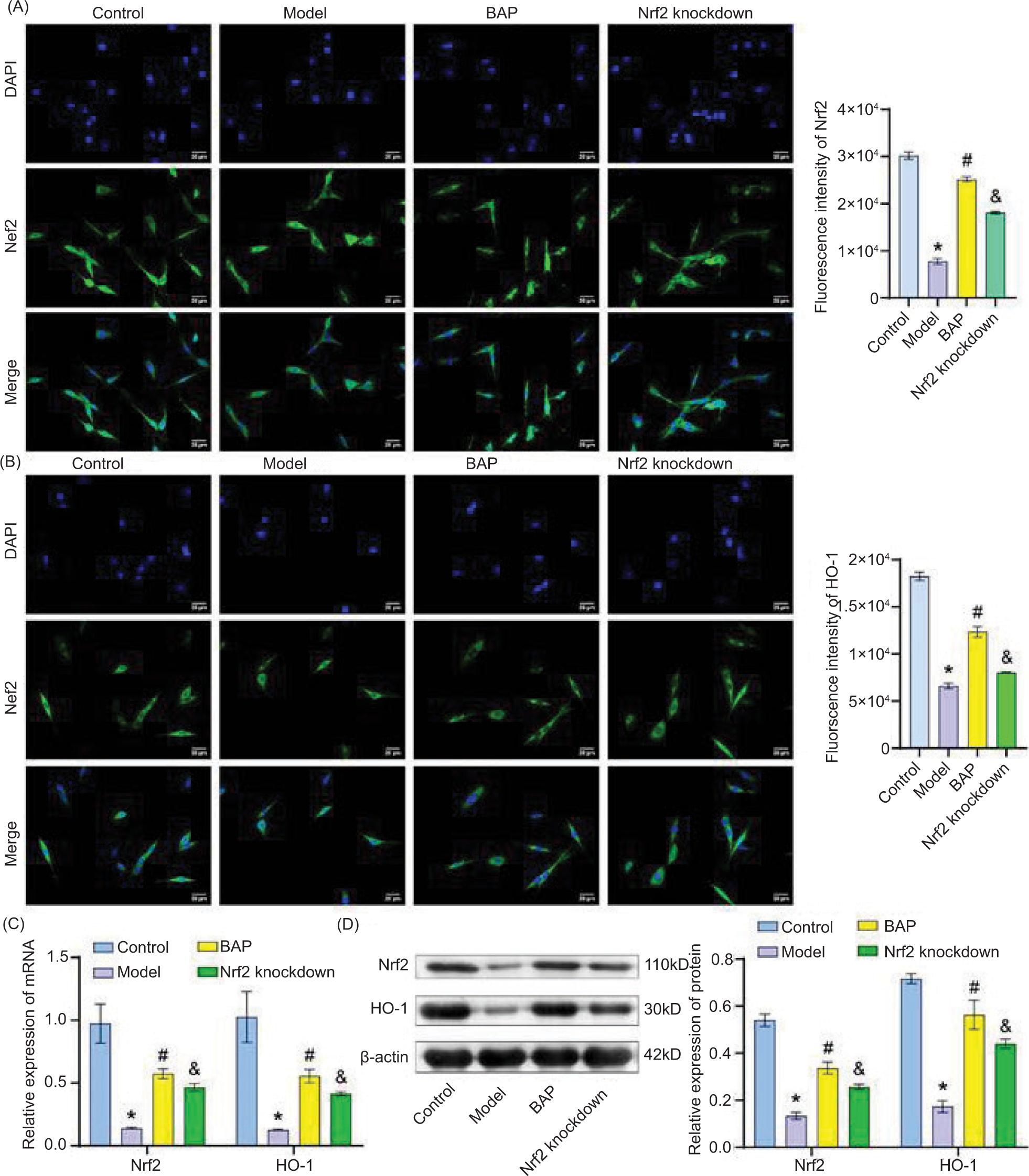 Figure 6. BAP regulated Nrf2/HO-1 signaling pathway in OGD/R-treated SH-SY5Y cells. (A, B) The expressions of Nrf2 and HO-1 were detected by immunofluorescence, scale bar = 25 μm. (C, D) RT-qPCR and western blot were applied to analyze Nrf2 and HO-1 expression. *P < 0.05 vs Control group, #P < 0.05 vs Model group, &P < 0.05 vs BAP group.