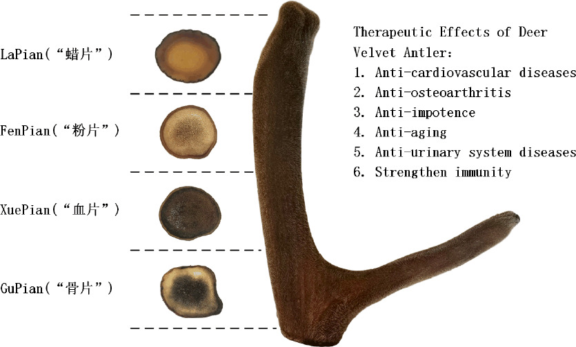 Figure 1. Medicinal properties and quality grades of velvet antler are described schematically.