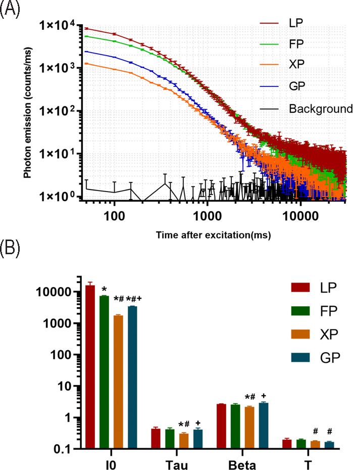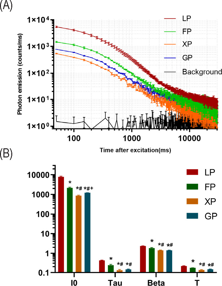 Figure 3. Velvet antler samples (Cervus elaphus Linnaeus) were measured using the DL method. (A) Curves of DL decay for LP, FP, XP and GP. The data are presented as mean ± standard error of mean (SEM). Take note of the log–log scale used to visualize the data; (B) Comparing the DL attributes of LP, FP, XP and GP using histograms. *FP, XP or GP versus LP, P < 0.05. #XP or GP versus FP, P < 0.05. +XP versus GP, P < 0.05. Beta is the decay rate of DL, I0 denotes the beginning intensity of DL curve, and T and Tau denote decay time and DL features, respectively.