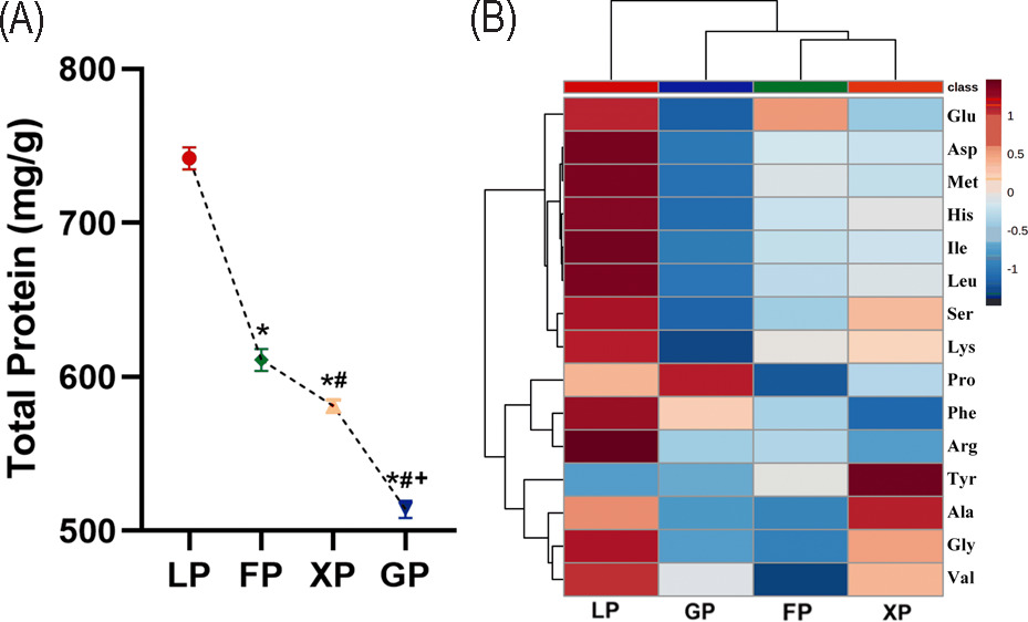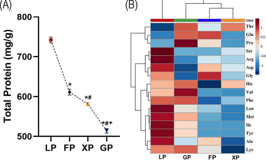 Figure 5. Velvet antler samples (Cervus elaphus Linnaeus) were measured for total protein and specific amino acid contents using chemical tests. (A) Variation in total protein content between LP, FP, XP, and GP. *FP, XP or GP versus LP, P < 0.05. #XP or GP versus FP, P < 0.05. +XP versus GP, P < 0.05. (B) Heat map of amino acid content in LP, FP, XP and GP samples.