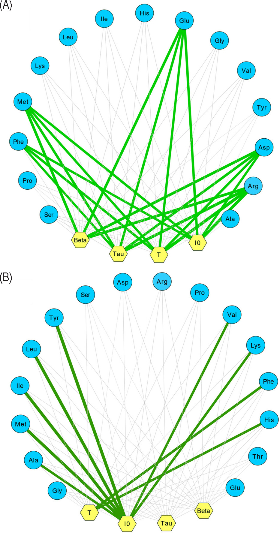 Figure 6. Correlation network between amino acids identified and DL characteristics determined in LP, FP, XP and GP samples. Green lines indicate positive and strong correlations (|r| > 0.70). The remaining correlations (|r| < 0.70) are denoted by gray lines. The thicker the line, the greater the link, and the length of each line is irrelevant. (A) Cervus nippon Temminck. (B) Cervus elaphus Linnaeus.