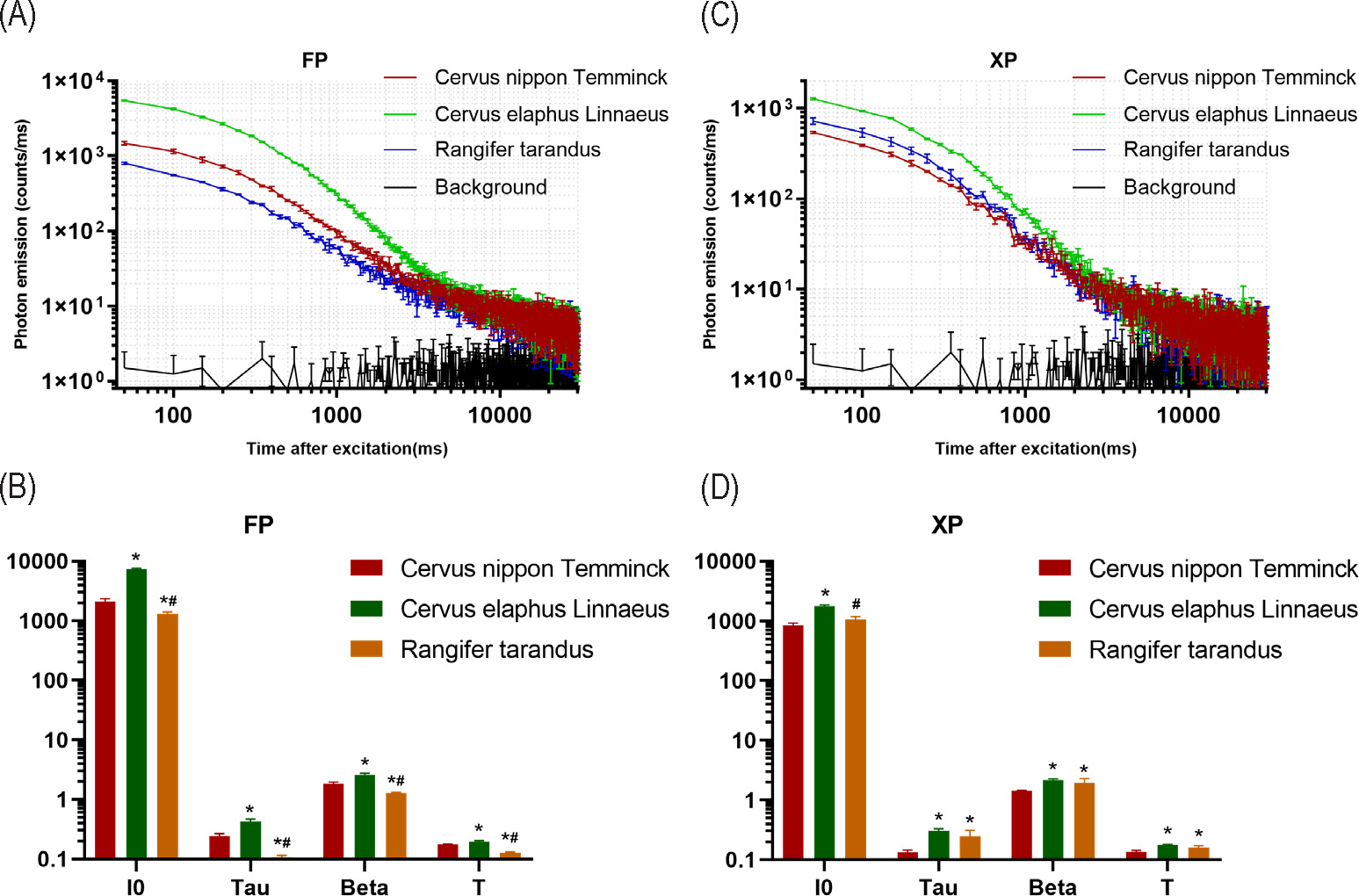 Figure 7. Velvet antler FP and XP samples of the three deer species were measured using the DL method. (A) and (C) Curves of DL decay for FP and XP. The data are presented as mean ± standard error of mean (SEM). Take note of the log–log scale used to visualize the data. (B) and (D) Comparison of the DL attributes of FP and XP using histograms. *Cervus elaphus Linnaeus or Rangifer tarandus versus Cervus nippon Temminck, P < 0.05. #Cervus elaphus Linnaeus versus Rangifer tarandus, P < 0.05. Beta is the decay rate of DL, I0 denotes the beginning intensity of DL curve, and T and Tau denote decay time and DL features, respectively.