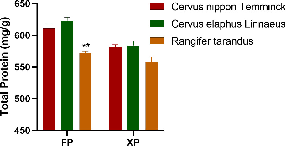 Figure 8. The total protein content of FP and XP samples among the three deer species. *Cervus elaphus Linnaeus or Rangifer tarandus versus Cervus nippon Temminck, P < 0.05. #Cervus elaphus Linnaeus versus Rangifer tarandus, P < 0.05.