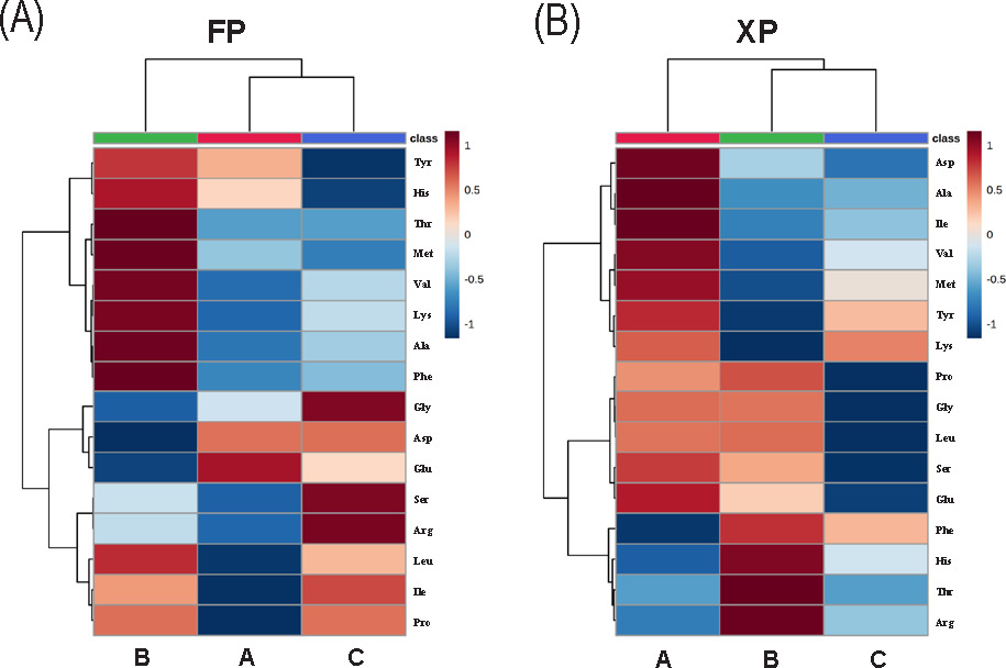 Figure 9. Heat map of amino acid content in FP and XP samples of the three deer species. “A” denotes Cervus nippon Temminck samples. “B” denotes Cervus elaphus Linnaeus samples. “C” denotes Rangifer tarandus samples. (A) Comparison of amino acid content in FP samples. (B) Comparison of amino acid content in XP samples.