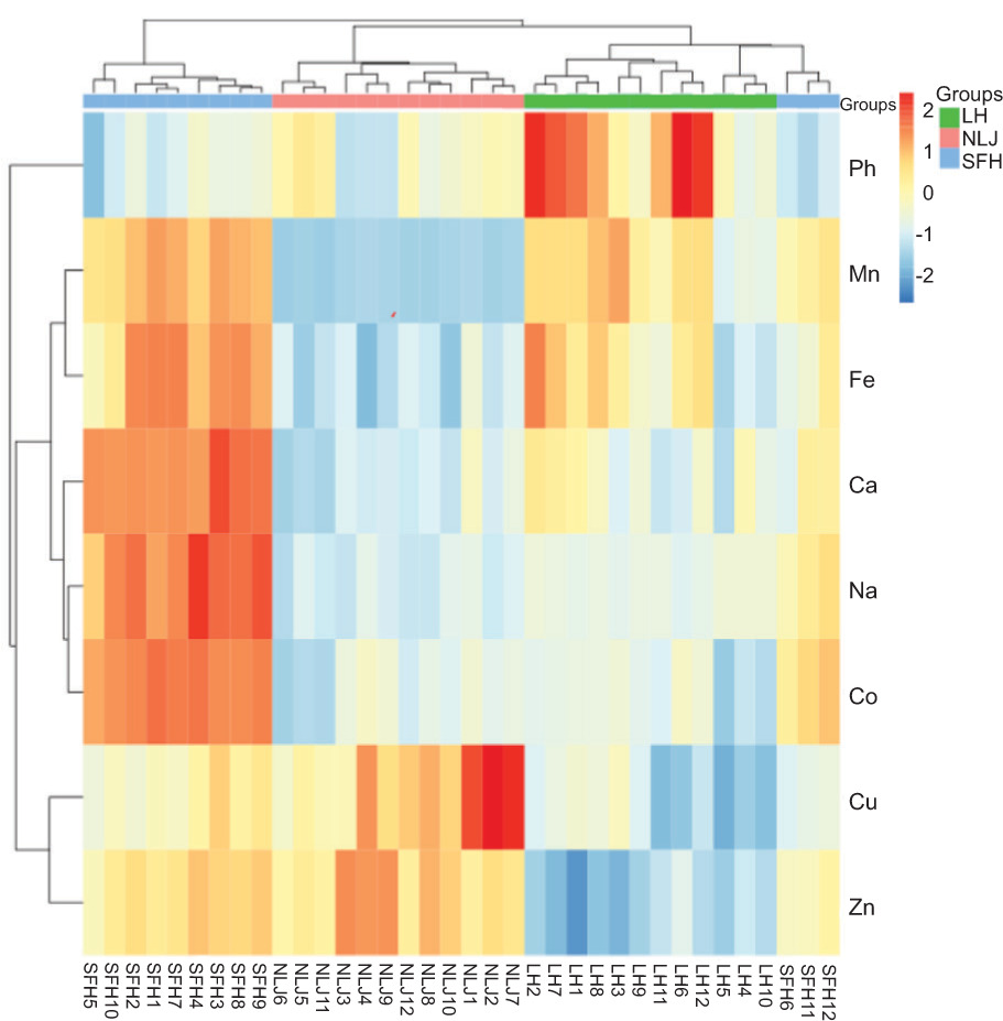 Figure 2. Hierarchical cluster analysis (HCA) heat map for geographic discrimination of wild Eriocheir sinensis samples from three water systems based on eight characteristic elements.