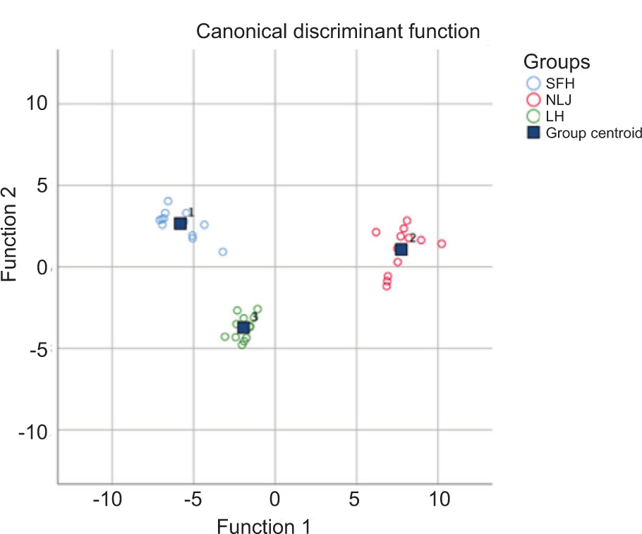 Linear discriminant analysis was a supervised data classification method with known samples used as training sets under the premise of assumed sample classification, in which a discrimination model could be established based on correlations between samples of different categories and then applied to discriminate and classify unknown samples. A comprehensive and quantifiable origin traceability model was achieved. The “leave- one-out method” was used for cross-validation of model, that is, samples in the training set, except a certain sample, were used as the training set, and the relevant discriminant function was established to discriminate samples (Luo et al., 2019). In this way, each sample could be used as a test set to verify the discriminant function established using the remaining samples, thereby examining the stability of discrimination model. S-LDA was performed to determine the most useful variables on the basis of LDA, to eliminate the interfering information, and to discriminate geographical origin with fewer variables (Mamede et al., 2022). In this study, characteristic elements (Mn, Ca, Na, Fe, Co, Zn, Cu, and Pb) derived from PCA were used to construct S-LDA model. The results exhibited that the predicted classification accuracy achieved for the samples from the three systems was 100%, and the discrimination accuracy in cross- validation reached 100% (Table 3).