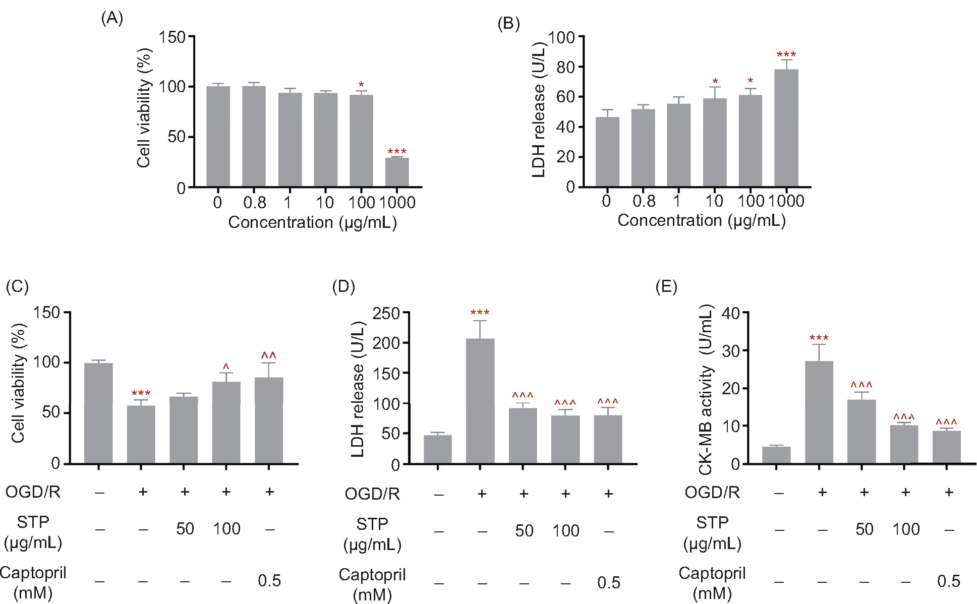 Figure 2. Shexiang Tongxin pills increased OGD/R-induced cardiomyocyte survival. (A) MTT assay was performed to evaluate the viability of H9c2 cells treated with different concentrations of STP (from 0 μg/mL to 1,000 μg/mL). (B) LDH assay was performed to evaluate the cytotoxicity of H9c2 cells treated with different concentrations of STP (from 0 μg/mL to 1,000 μg/mL). (C) MTT assay was performed to evaluate the viability of H9c2 cells induced by OGD/R and treated with STP or captopril. (D) LDH assay was performed to evaluate the cytotoxicity of H9c2 cells induced by OGD/R and treated with STP or captopril. (E) ELISA was performed to evaluate the CK-MB activity of H9c2 cells induced by OGD/R and treated with STP or captopril. *P < 0.05, **P < 0.01, ***P < 0.001, compared to the 0-μM group; ^P < 0.05, ^^P < 0.01, ^^^P < 0.001, compared to the OGD/R group.