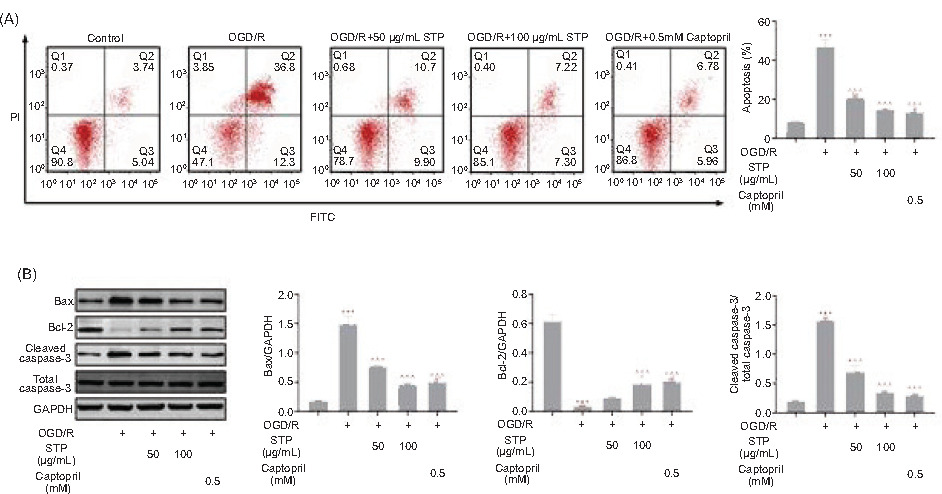 Furthermore, the impact of STP on the apoptosis of H9c2 cells was also elevated by flow cytometry and Western Blot analysis. As shown in Figure 3A, the cell apoptosis rate of H9c2 cells was dramatically increased in the cells treated with OGD/R (P < 0.001), while STP or captopril treatment could reduce apoptosis rate in H9c2 cells induced by OGD/R. Additionally, the expression of Bax and cleaved caspase-3 was increased, while the expression of Bcl-2 was reduced in H9c2 cells induced by OGD/R, while STP or captopril treatment reversed these indices (Figure 3B). These data suggested that STP could increase cardiomyocyte survival and decrease the apoptosis of cardiomyocytes induced by OGD/R.