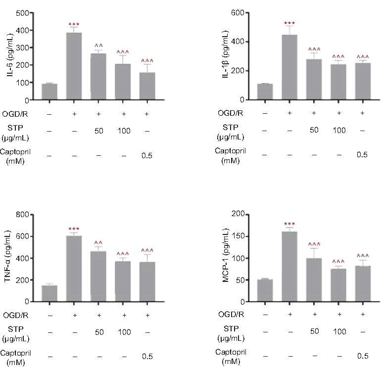 The measurement of inflammatory indexes in patients before and after the intervention was also done, so we also measured inflammatory index content at cellular level by ELISA. As shown in Figure 4, IL-6, IL-1β, TNF-α, and MCP-1 were significantly upregulated in H9c2 cells induced by OGD/R. At the same time, STP or captopril treatment could downregulate the increase of these inflammatory indexes in H9c2 cells induced by OGD/R. To summarize, STP ameliorated the OGD/R-induced inflammatory response in cardiomyocytes.