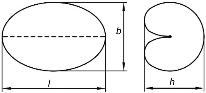 Figure 1. Measurement diagram of geometry dimensional size at three-axis directions for wheat grains, l, b, and h are the length, width, height of wheat grain, respectively, mm. The dotted line is the ventral groove of the wheat grain, placed horizontally backward.